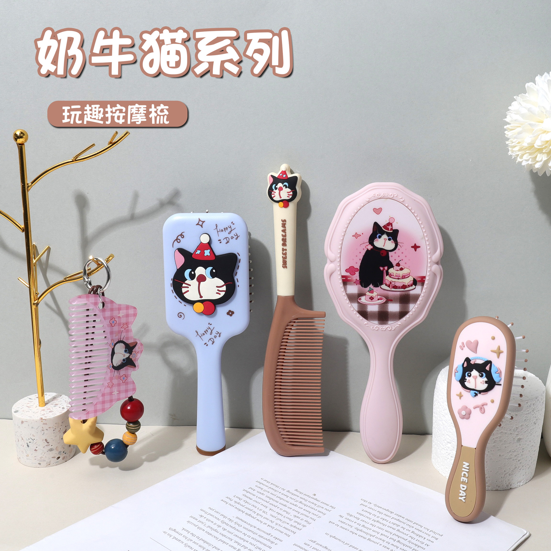 新款奶牛猫系列按摩梳学生女ins风可爱折叠镜梳气垫梳防静电梳子