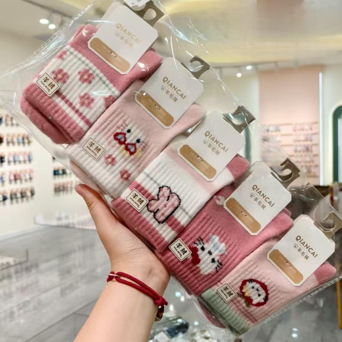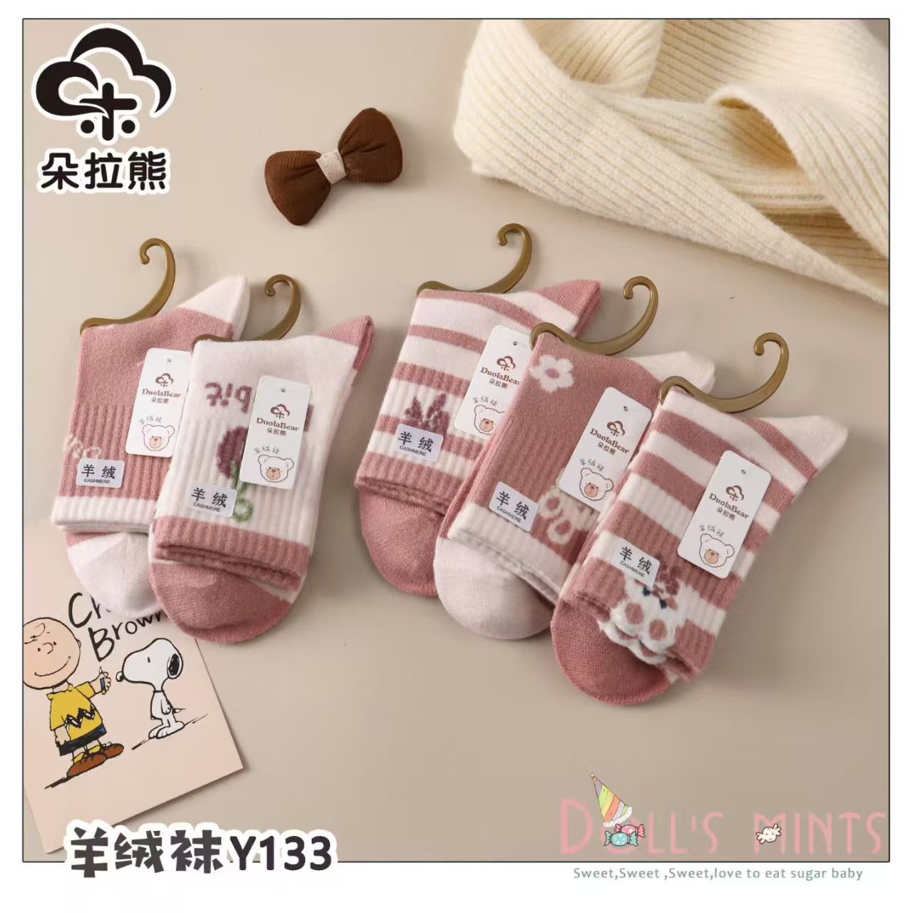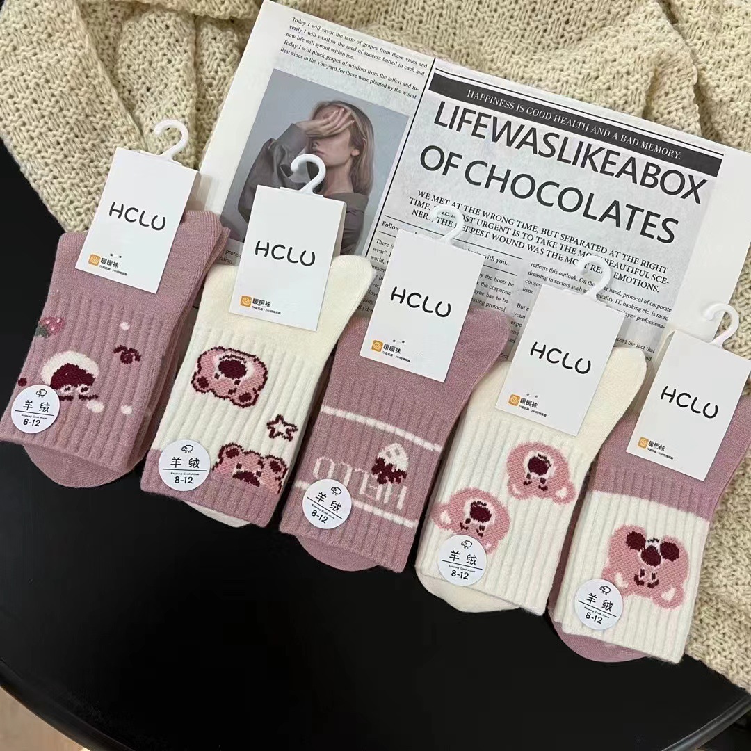 会诚露儿童冬季加厚羊绒袜保暖可爱卡通学院风中筒袜田园风羊毛袜