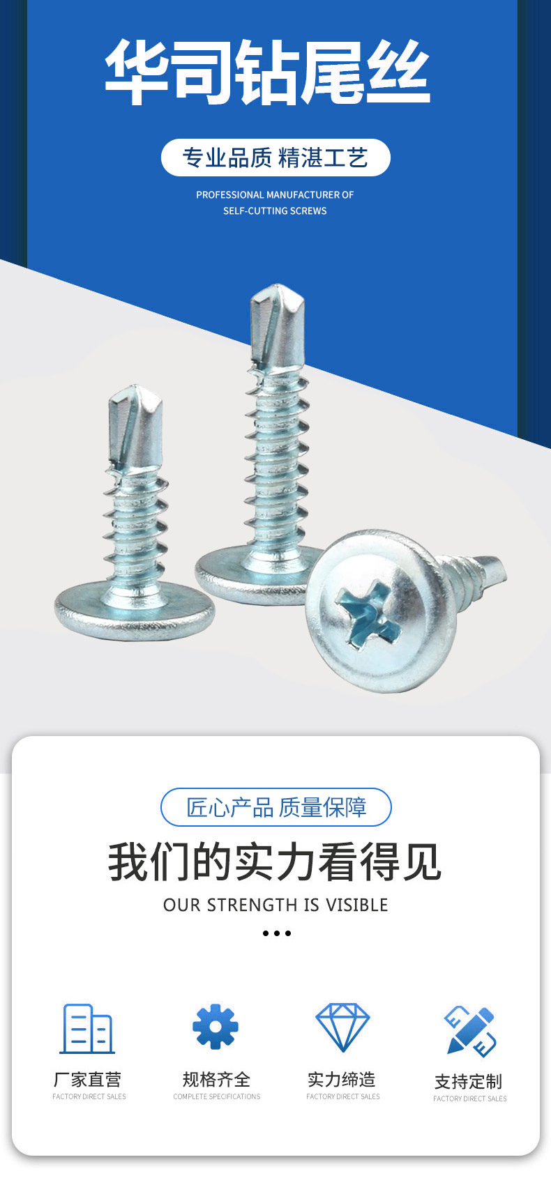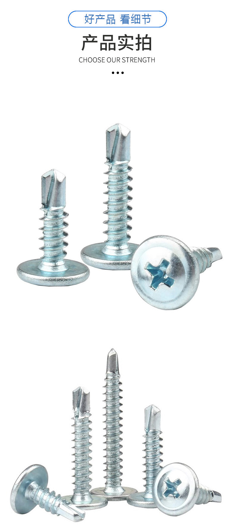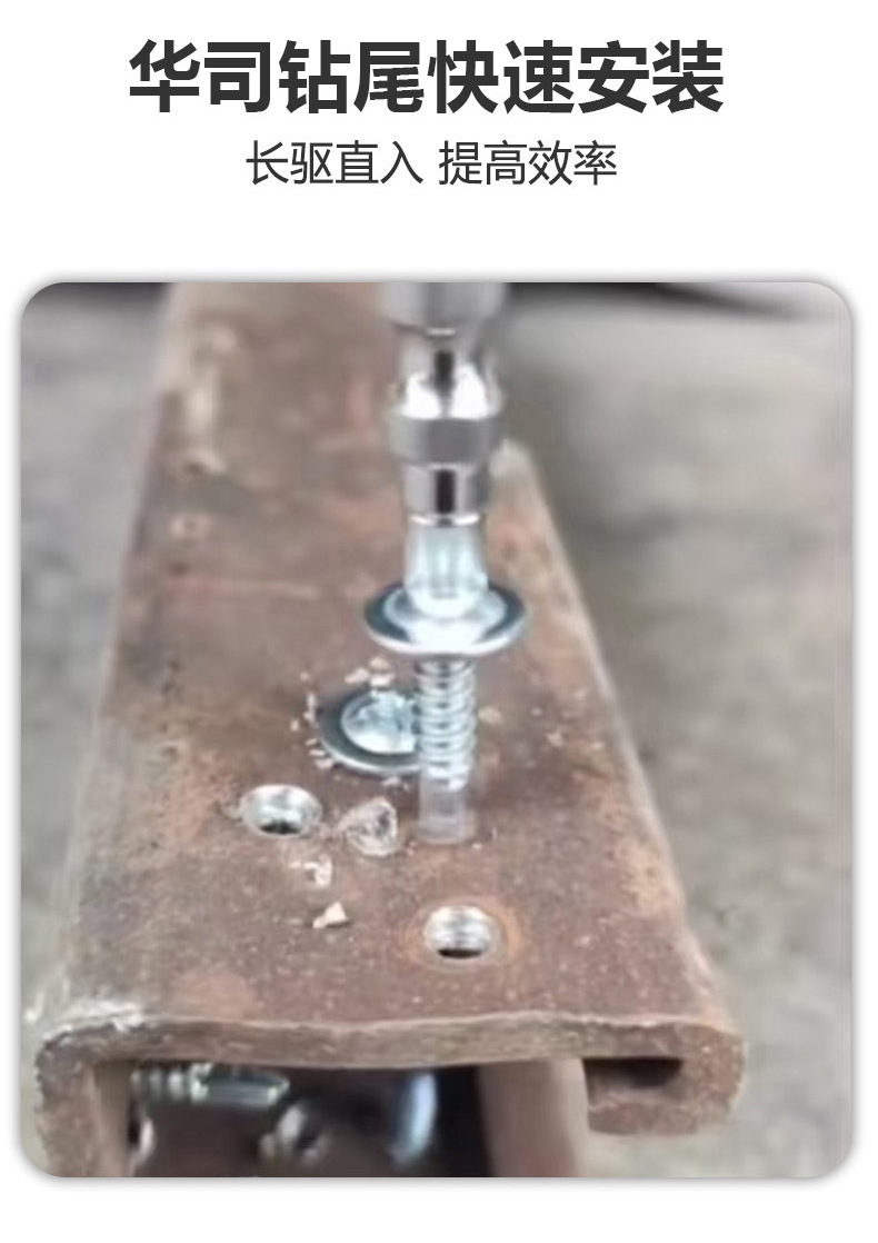 产品规格 M4.2*13(一斤325个),M4.2*16(一斤283个),M4.2*19(一斤254个),M4.2*25(一斤214个),M4.2*32(一斤177个),M4.2*38(一斤154个),M4.2*50(一斤120个),M4.8*16(一斤228个),M4.8*19(一斤211个),M4.8*25(一斤168个),M4.8*32(一斤142个),M4.8*38(一斤125个),M4.8*50(一斤98个),M4.8*60(一斤80个),M4.8*70(一斤72个),M4.8*80(一斤65个),M4.8*100(一斤52个)