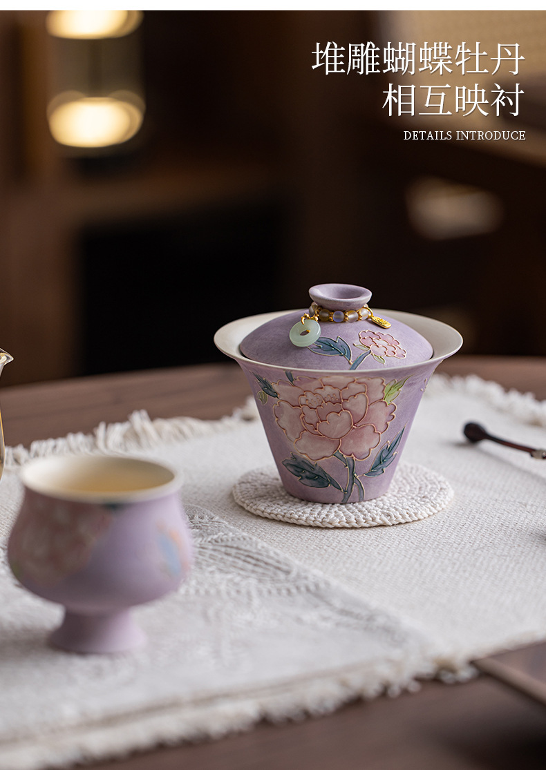 高颜值手绘立体堆雕牡丹三才盖碗陶瓷功夫茶具敬茶碗办公室泡茶