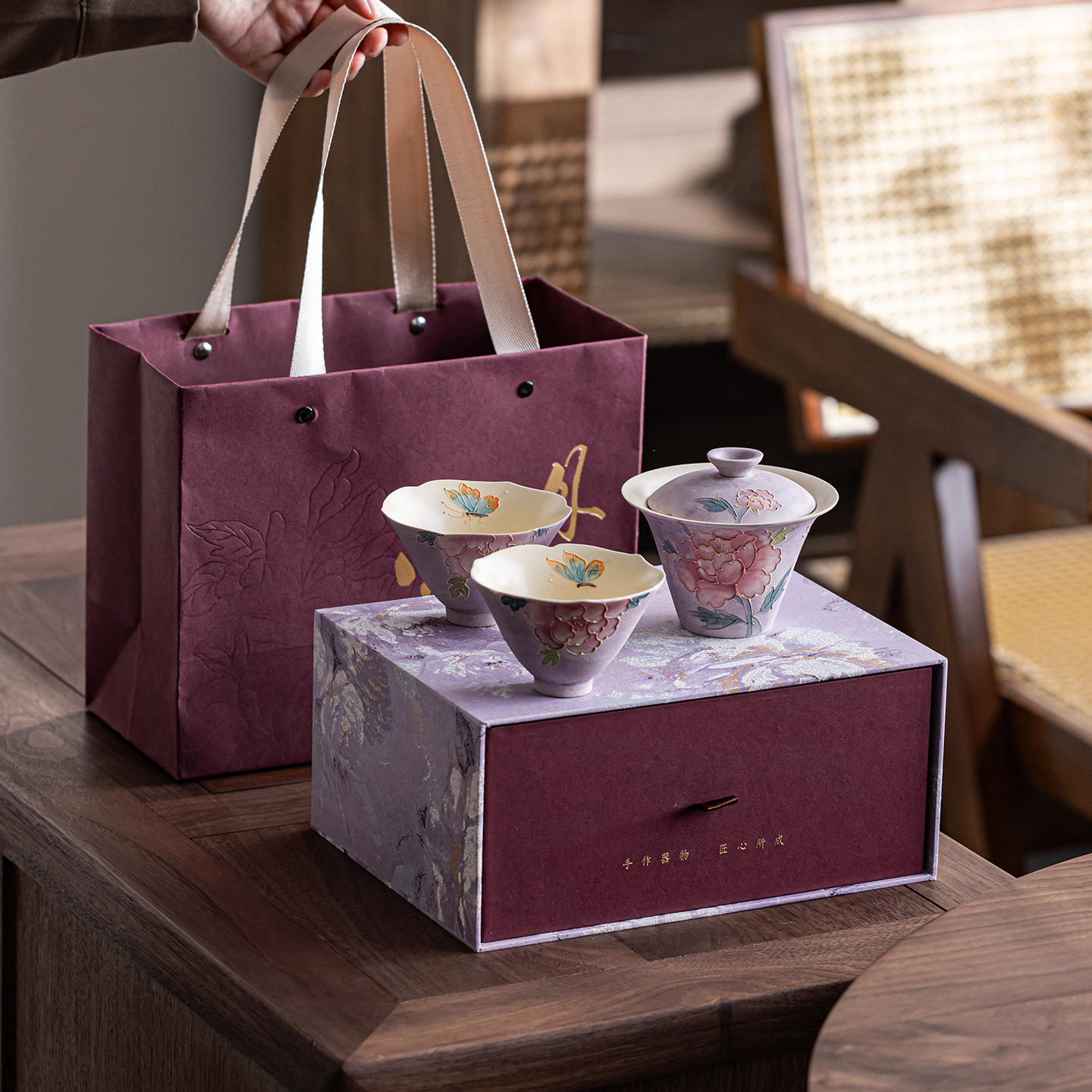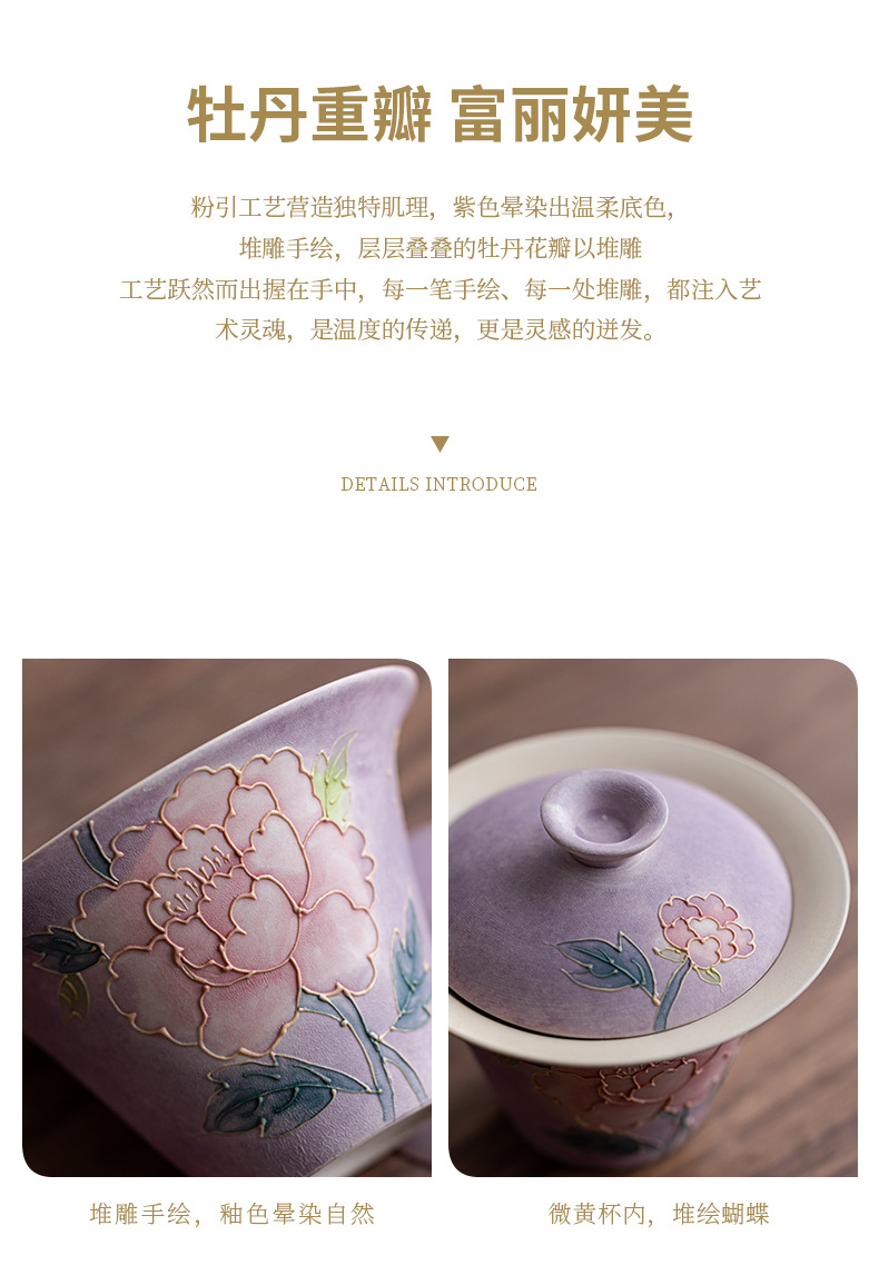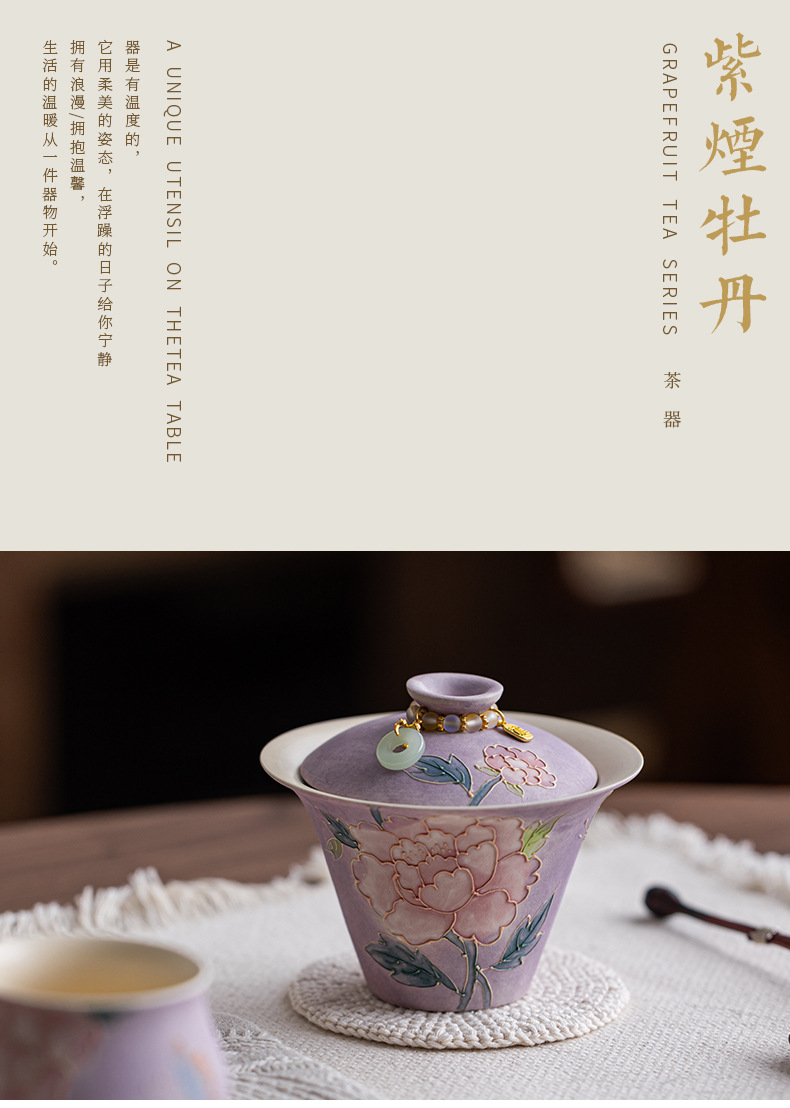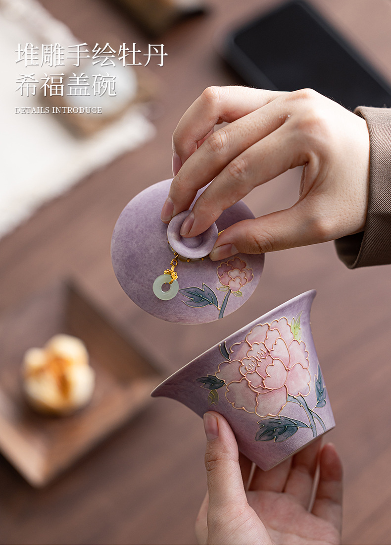 新款手绘紫烟牡丹希福盖碗家用陶瓷泡茶碗茶具茶杯送闺蜜