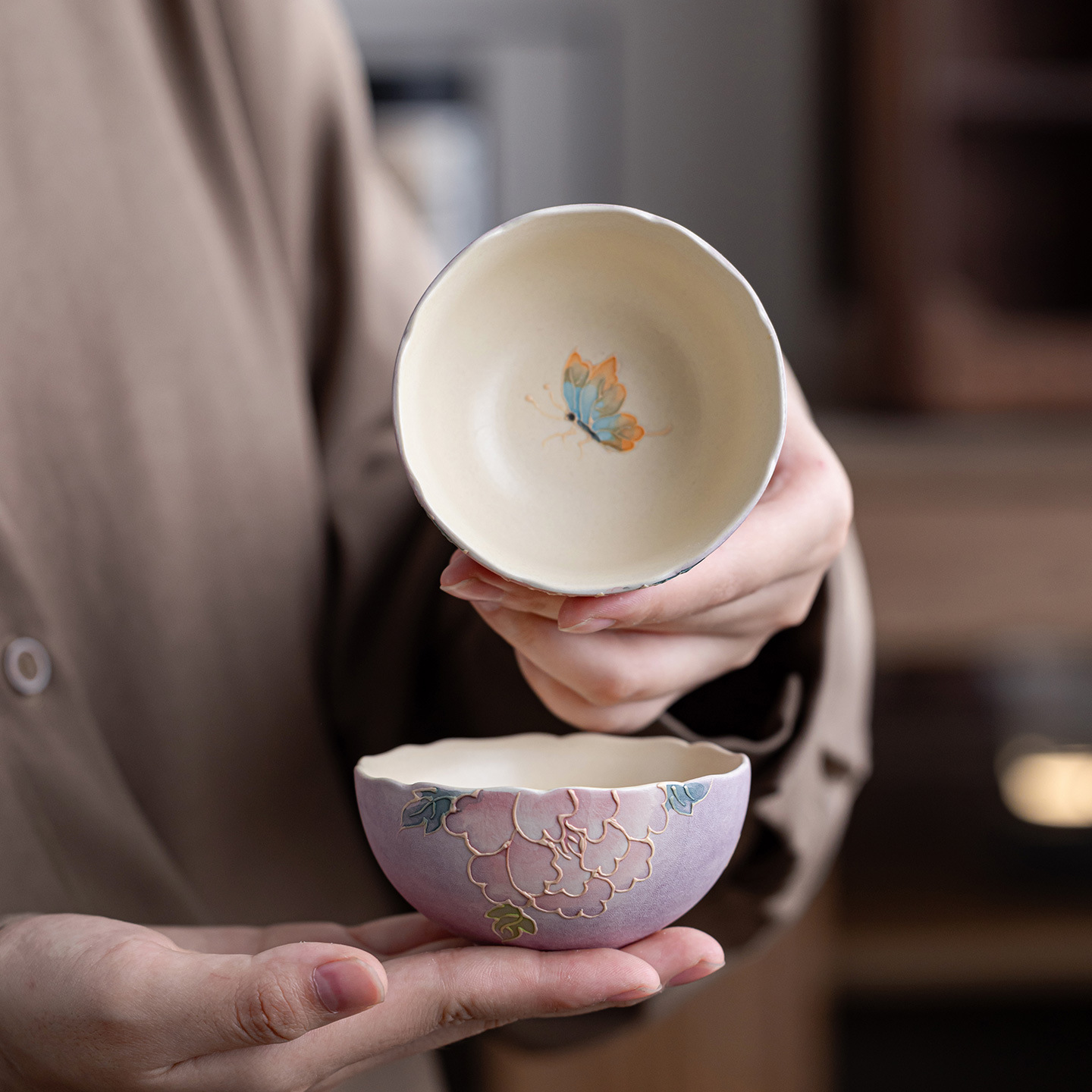 新中式手绘陶瓷牡丹普洱杯茶杯女士个人专用主人杯单杯功夫茶具