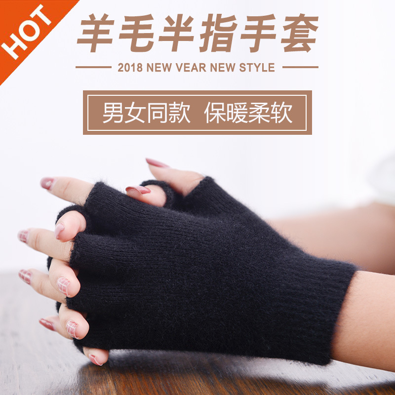 100%纯羊毛半指手套女士秋冬季新款分指露指男式手套学生针织保暖