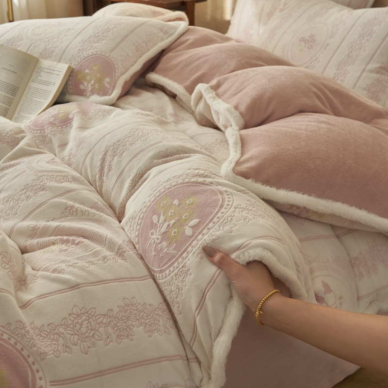 A类冬季高克重牛奶绒四件套加厚珊瑚绒花边被套抗静电雕花绒床单