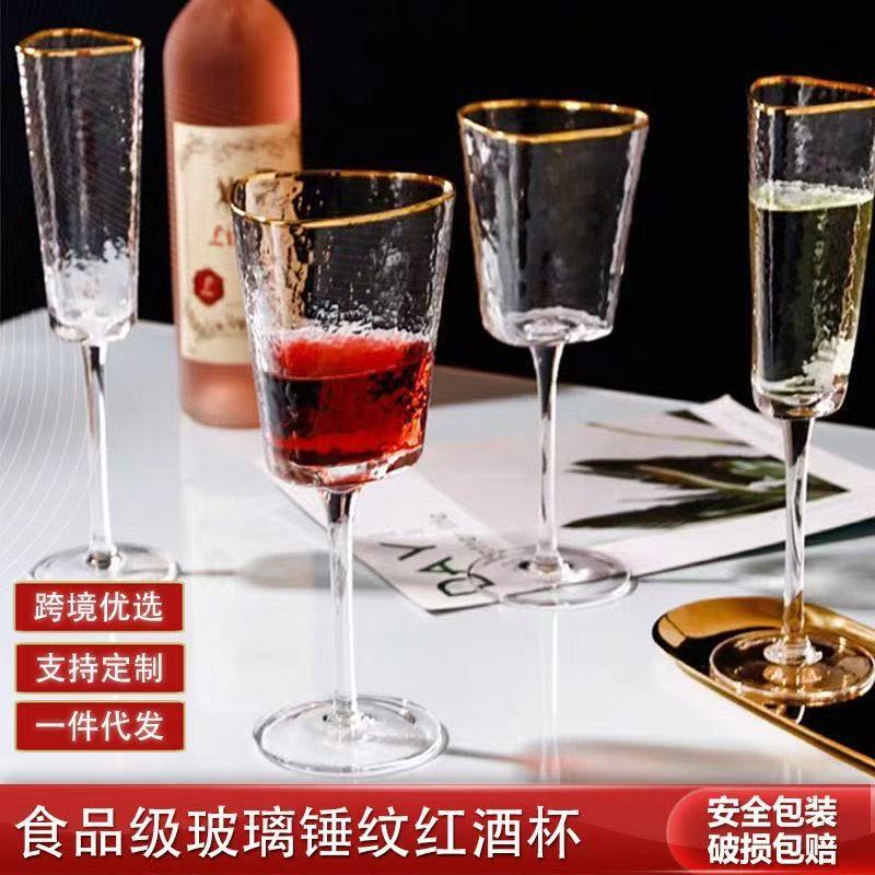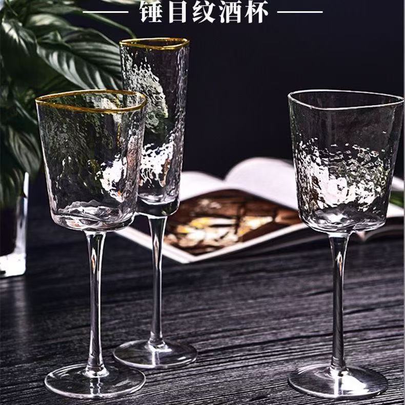 高级感金边锤纹三角玻璃杯高脚杯红酒杯香槟杯高级感白葡萄酒杯