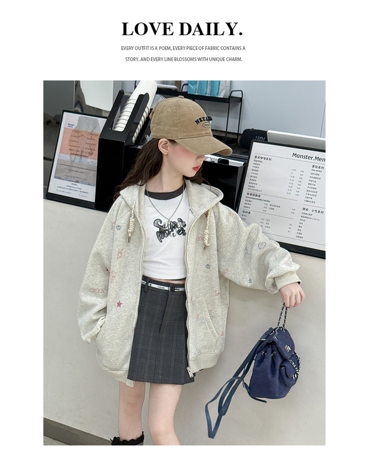 女童连帽卫衣外套2025秋季新款大童时髦洋气休闲碎花帽衫上衣开衫