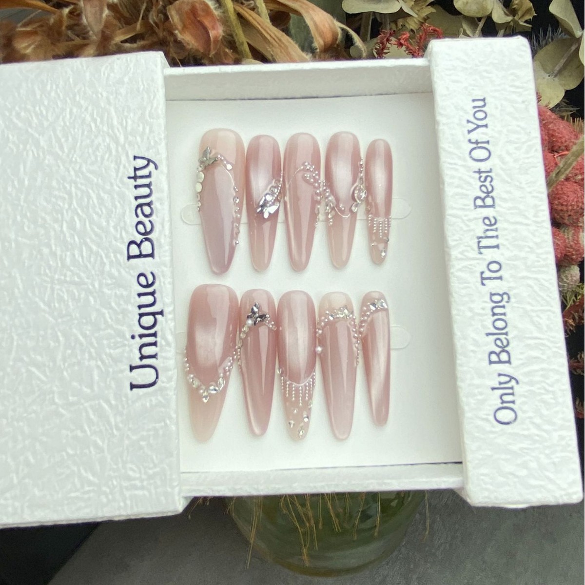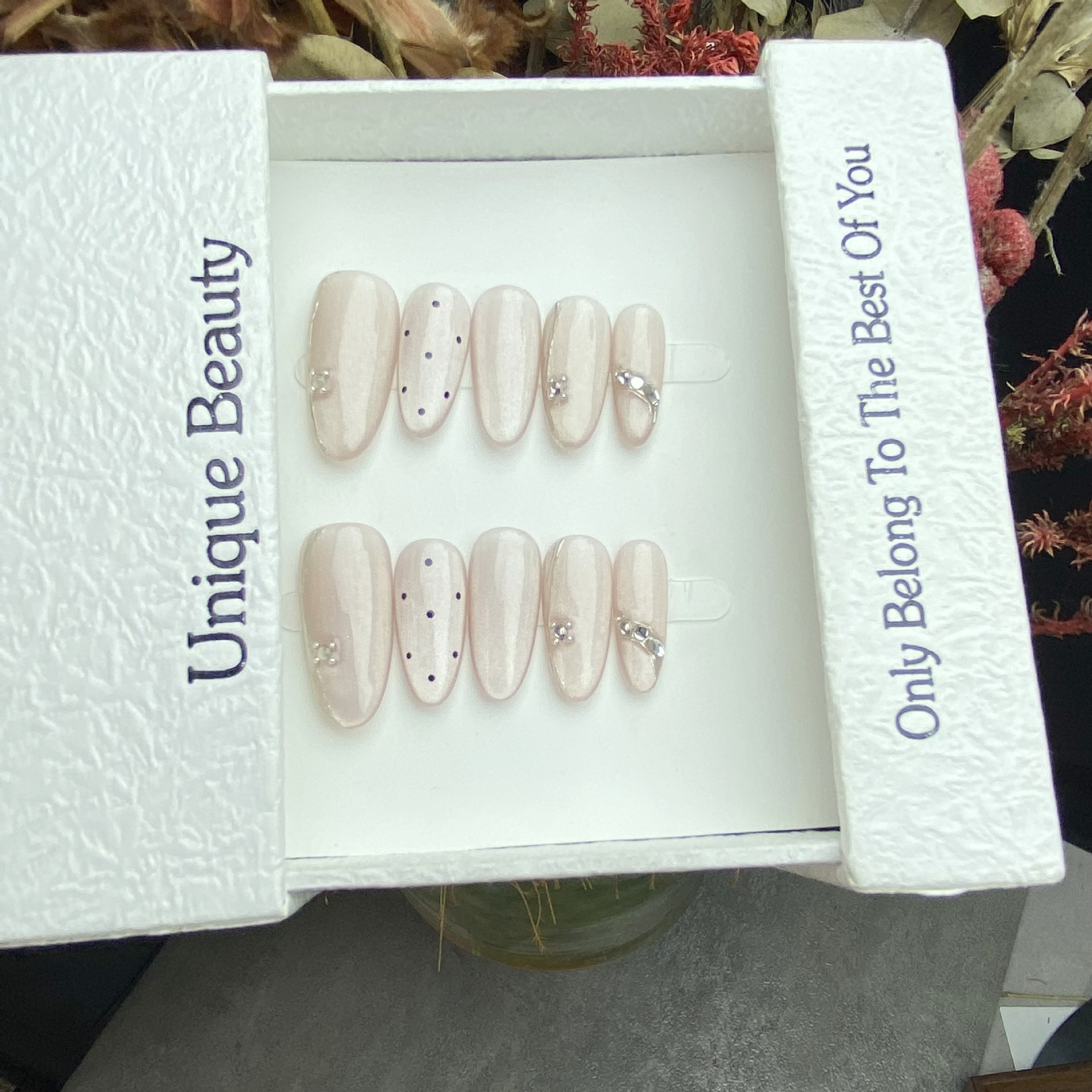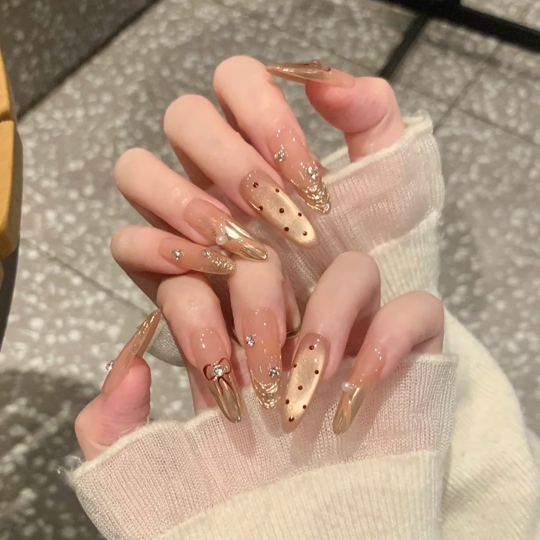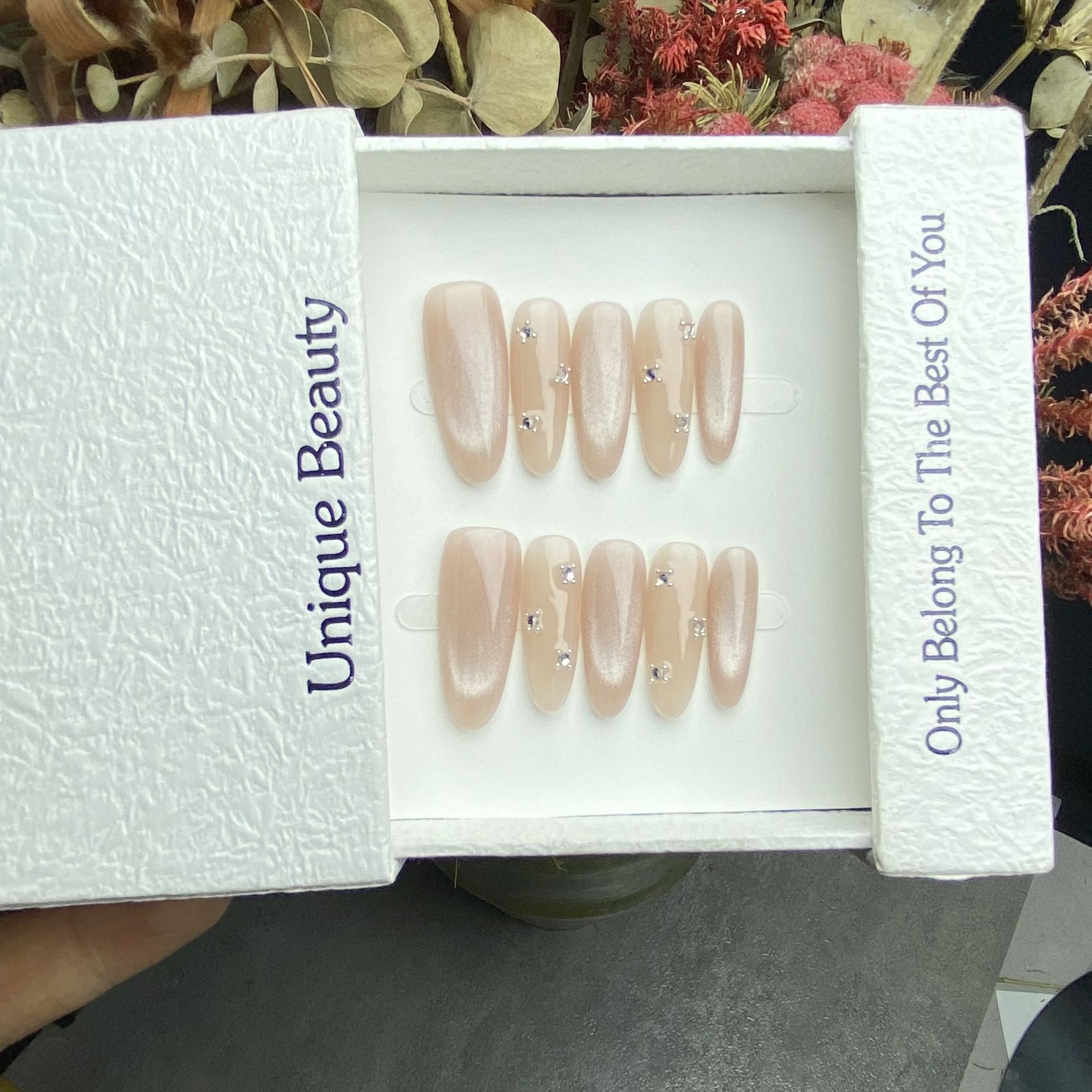 纯手工穿戴甲温柔风裸杏色香槟碎钻美甲显白气质细狗长尖秋冬款