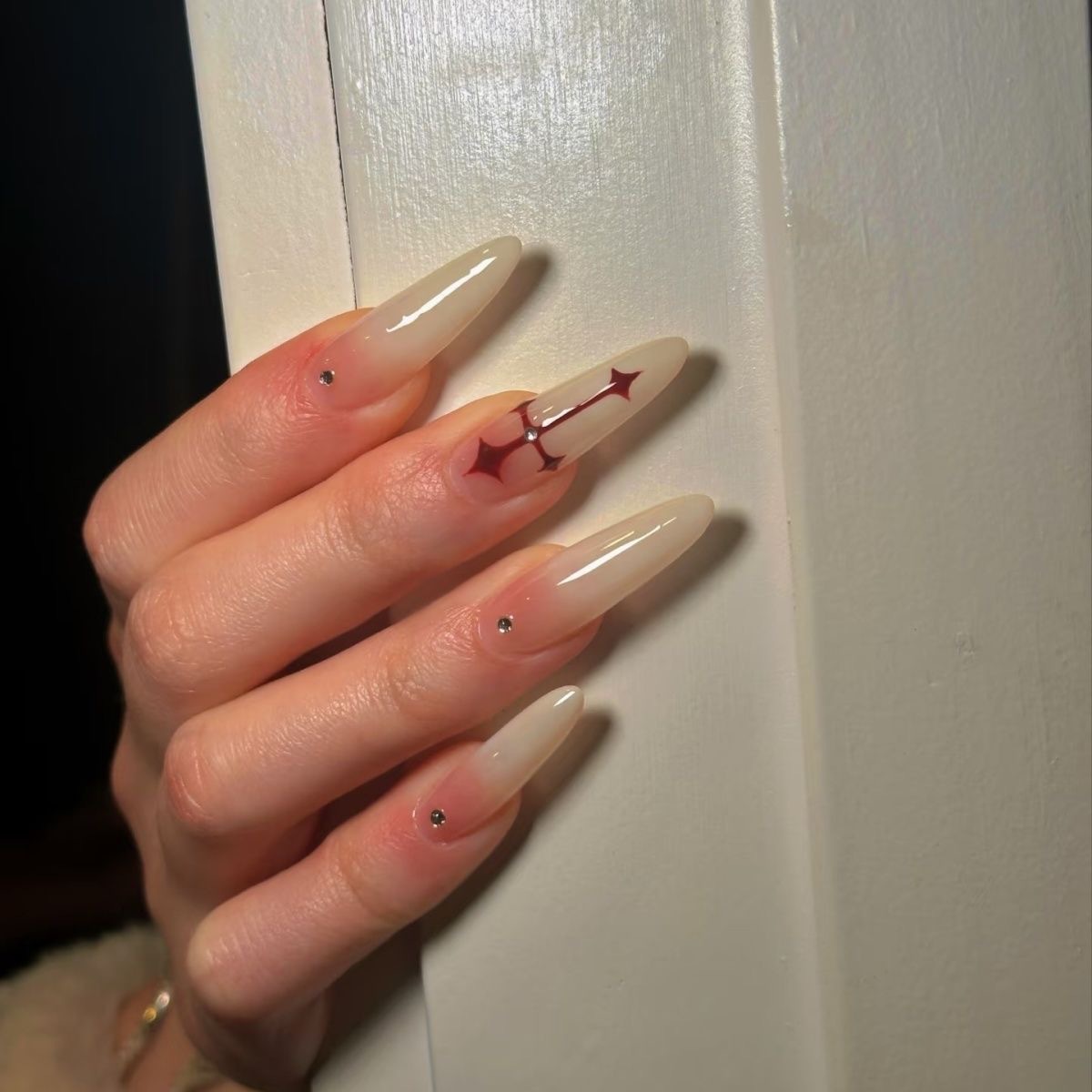 纯手工穿戴甲裸色渐变蕾丝乳白色辣妹高级感显白甜酷十字架美甲贴