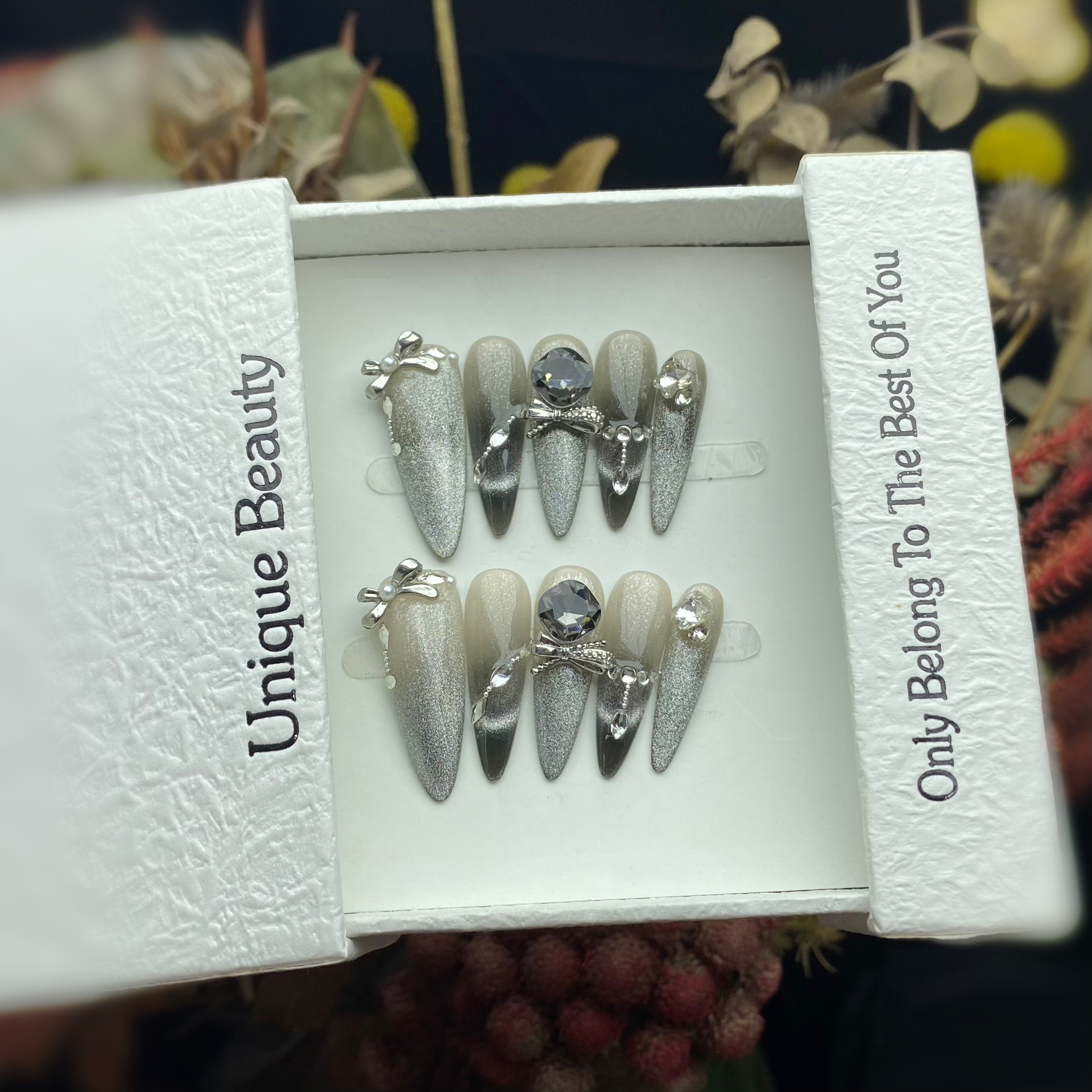 純手作りのネイル、キャッツアイジルコニアの輝き、グラデーションの蛇のようなデザイン、高級感、軽やかな贅沢、美白効果、取り外し可能なネイル