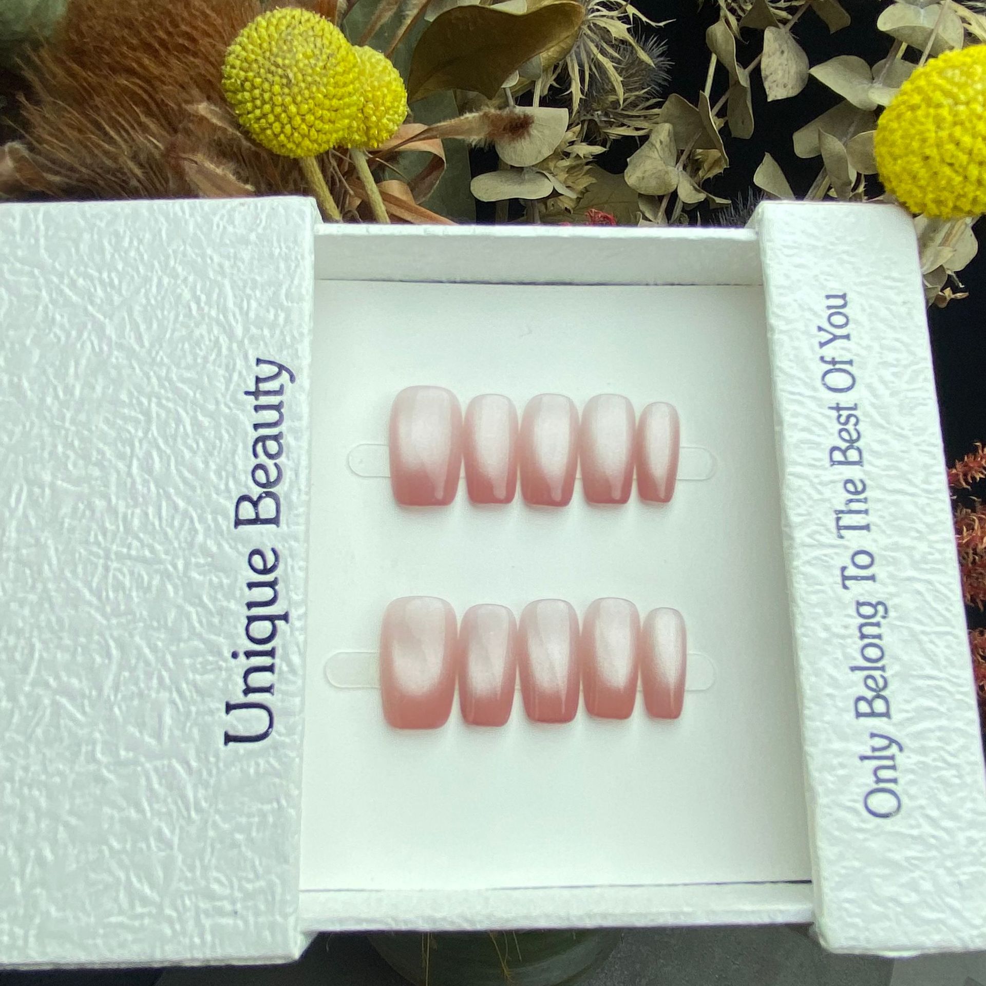 悦指先の純粋な手作りの高級グラデーションの高級なピンクの猫の目の裸の色は白いネイルを現して甲甲の切れの気質を着ます。