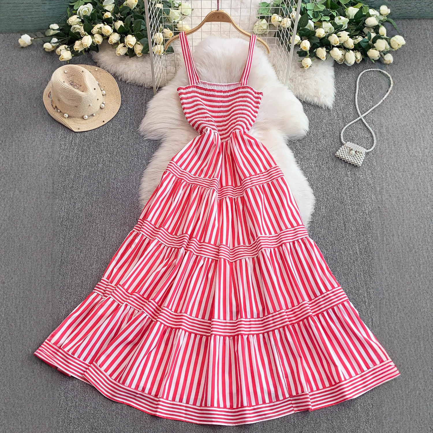 外贸韩系温柔粉色条纹吊带连衣裙女夏季复古设计松紧收腰显瘦大摆