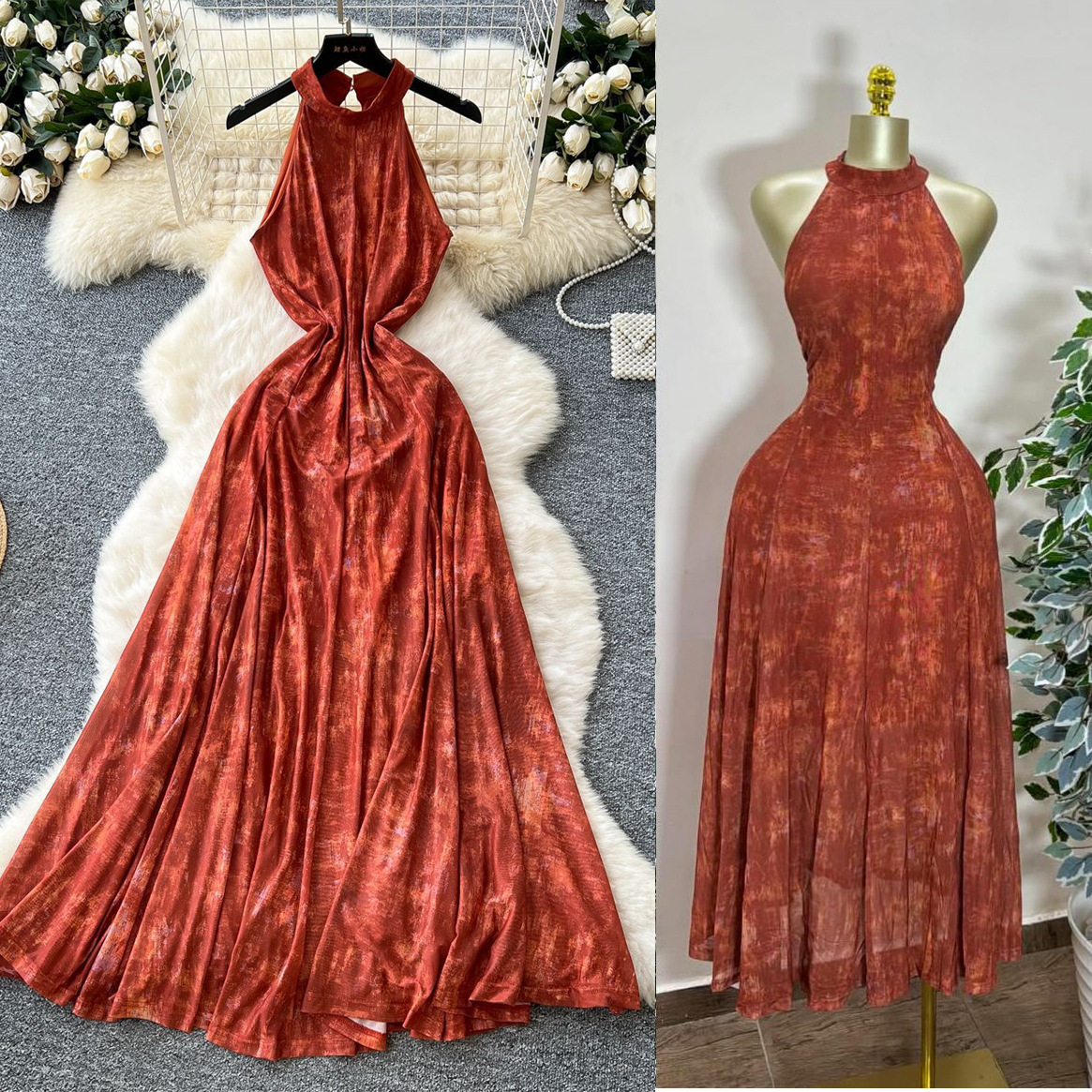 フレンチレトロスタイルのハイエンドブルーミングホルターネックノースリーブドレス、女性用、夏のウエストデザイン、美しい大きな裾のロングスカート