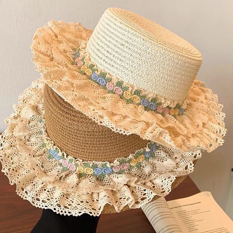 フランスの花レースの縁の麦わら帽子の女性の夏の大きいつばの平頂の帽子の海辺の砂浜の草は日焼け止めの日よけの帽子を編みます。