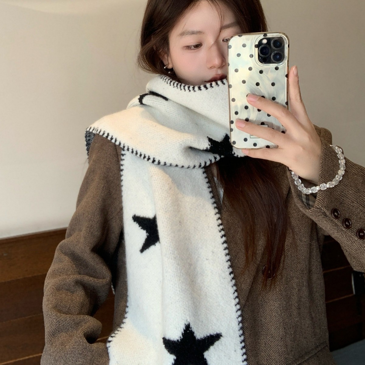 白色星星针织围巾女冬季韩系氛围感加厚保暖学生情侣护颈围脖披肩