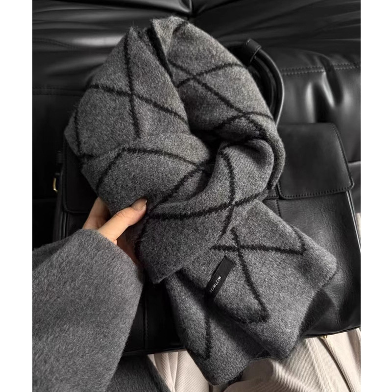 高级感含羊毛菱格双面针织围巾女冬季加厚保暖显气质格纹围脖男韩
