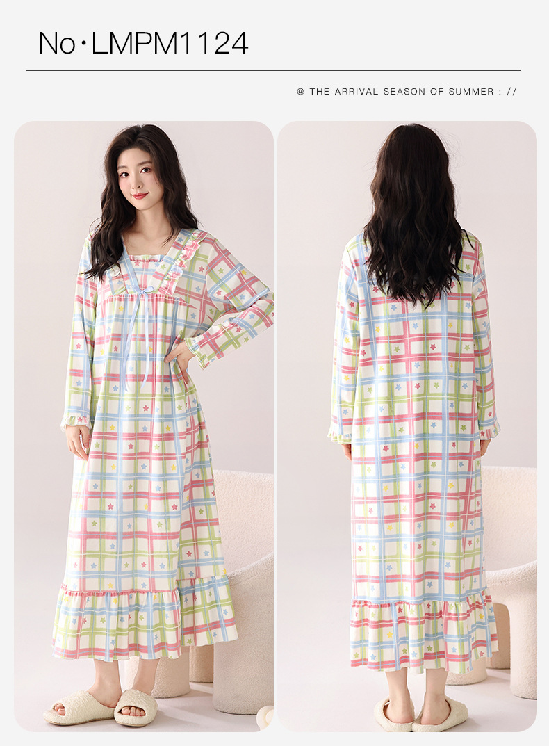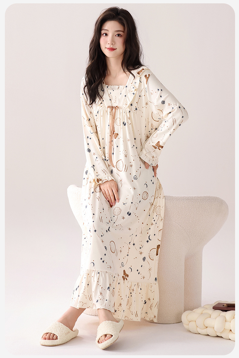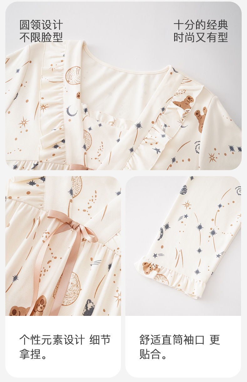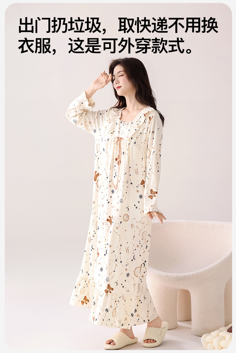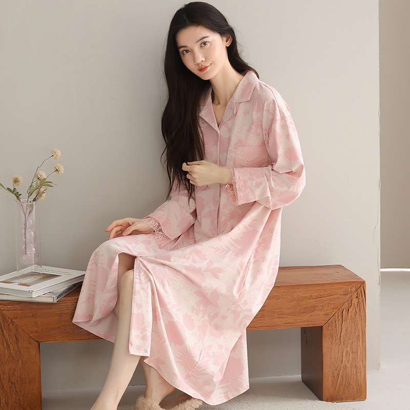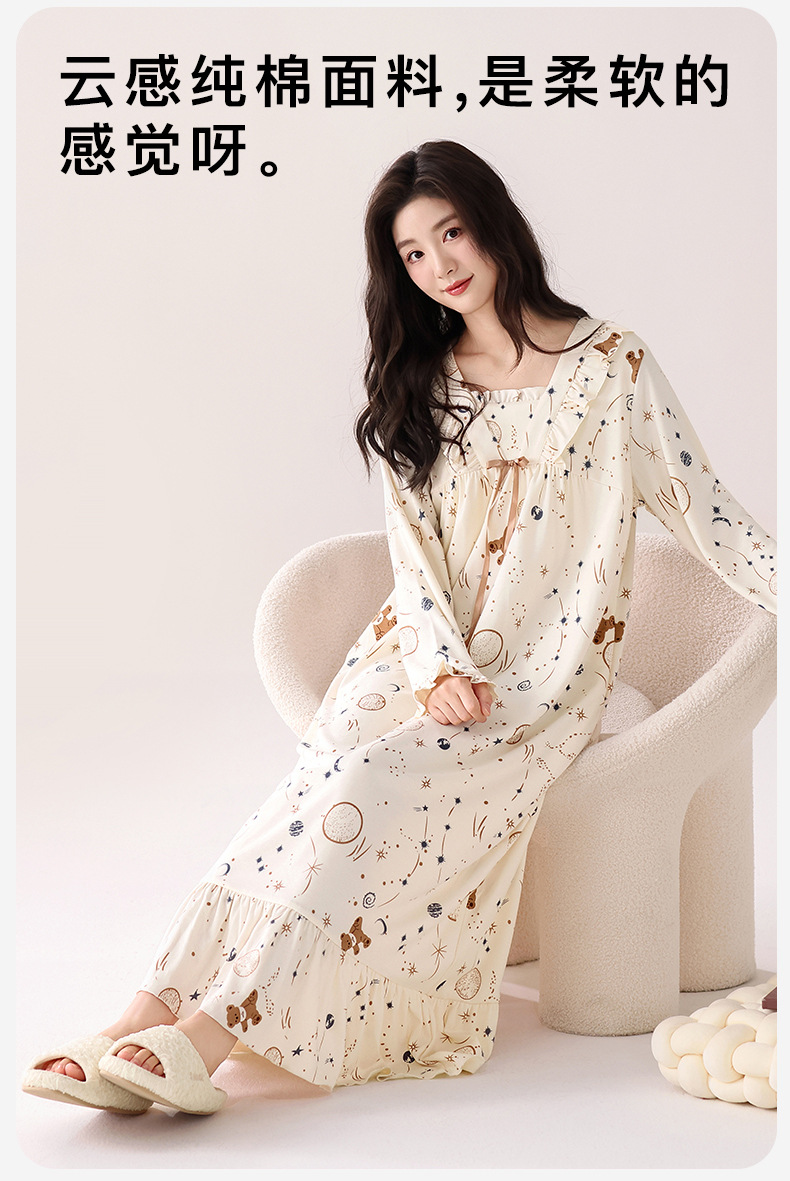2025秋冬新款100纯棉女士睡裙中长款开衫舒适透气睡衣春秋家居服