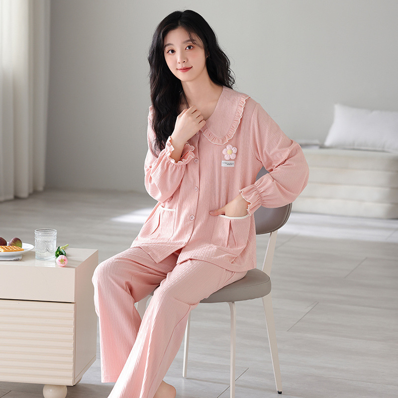 2024春秋の新しい長袖の甘いパジャマの女性ジャカードのフレームの綿のゆったりしたカーディガンの大きいサイズのスーツの部屋の服