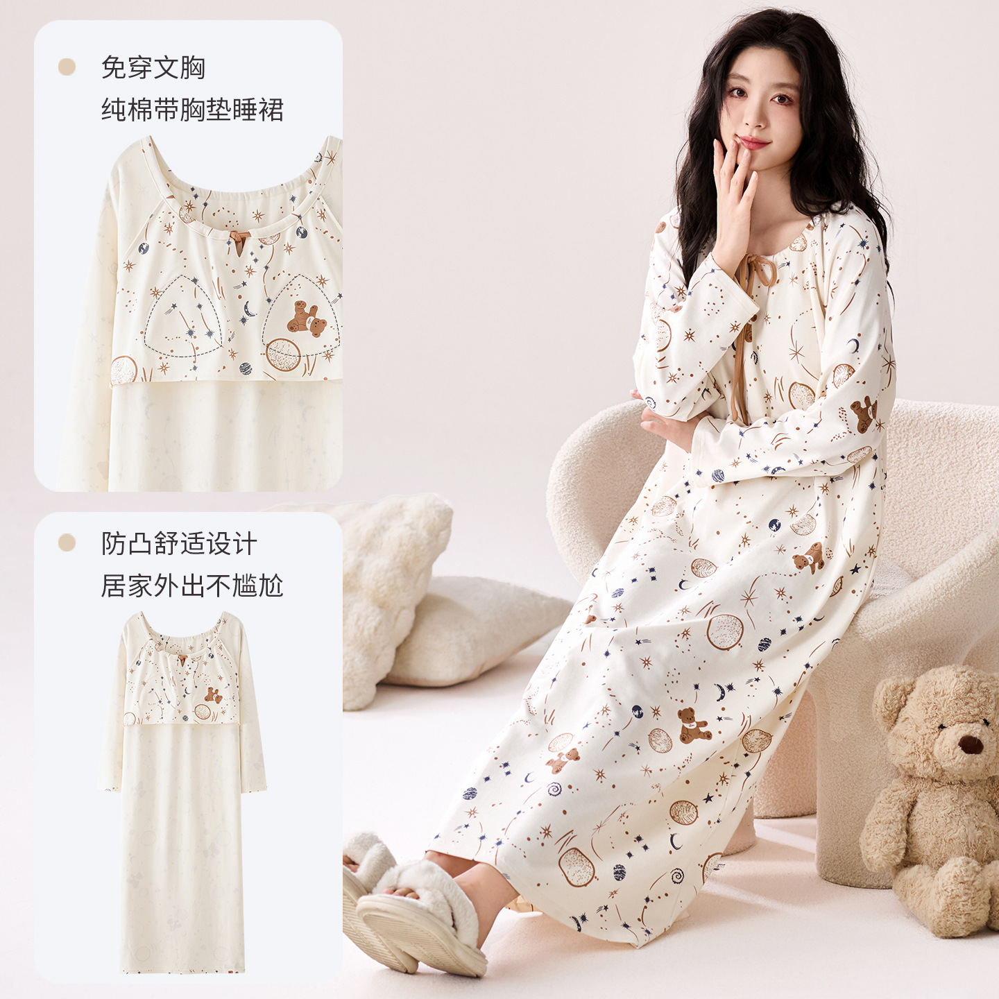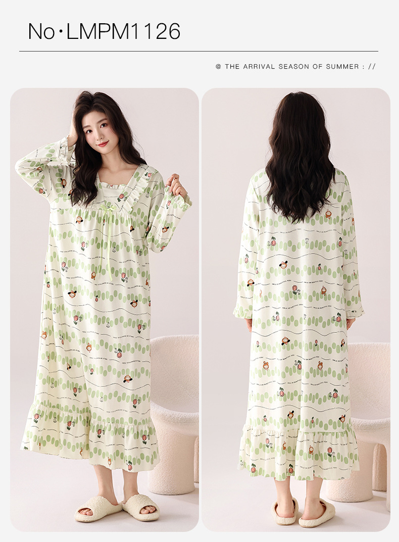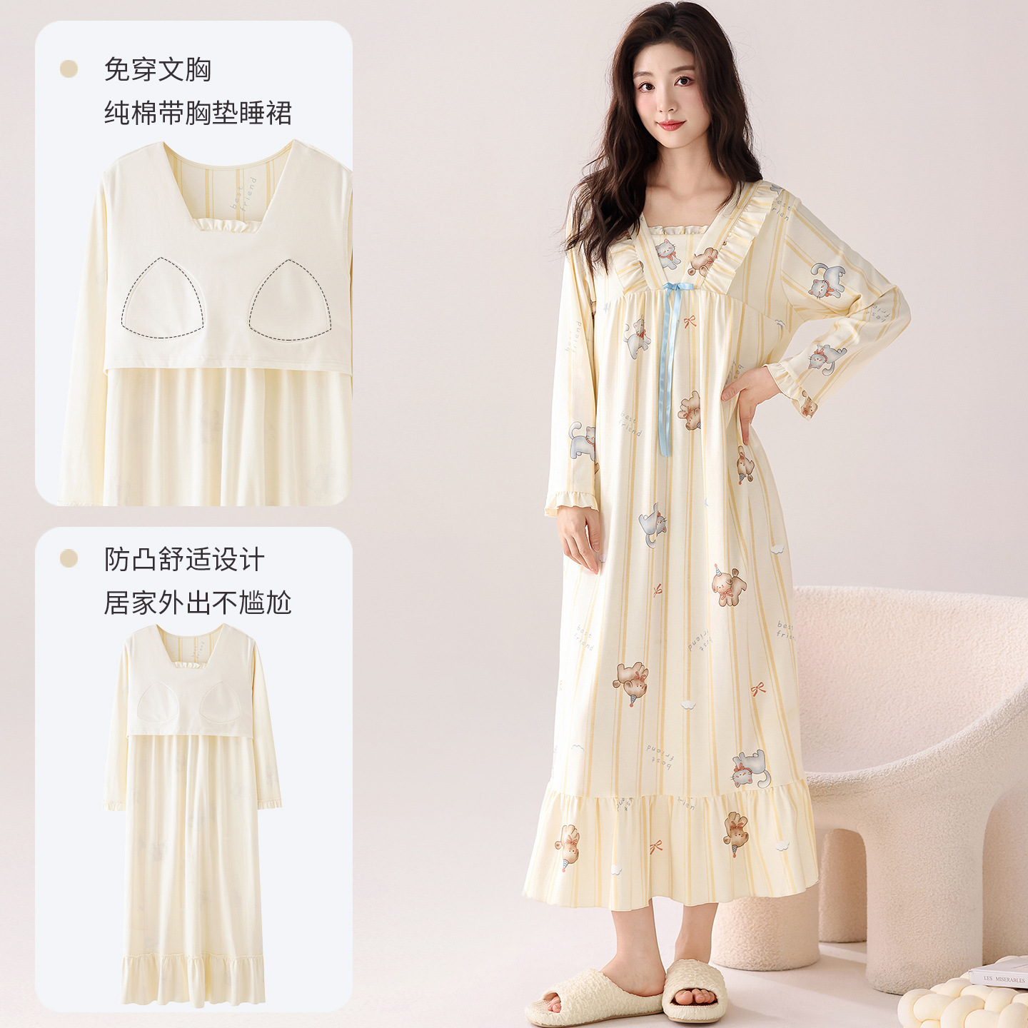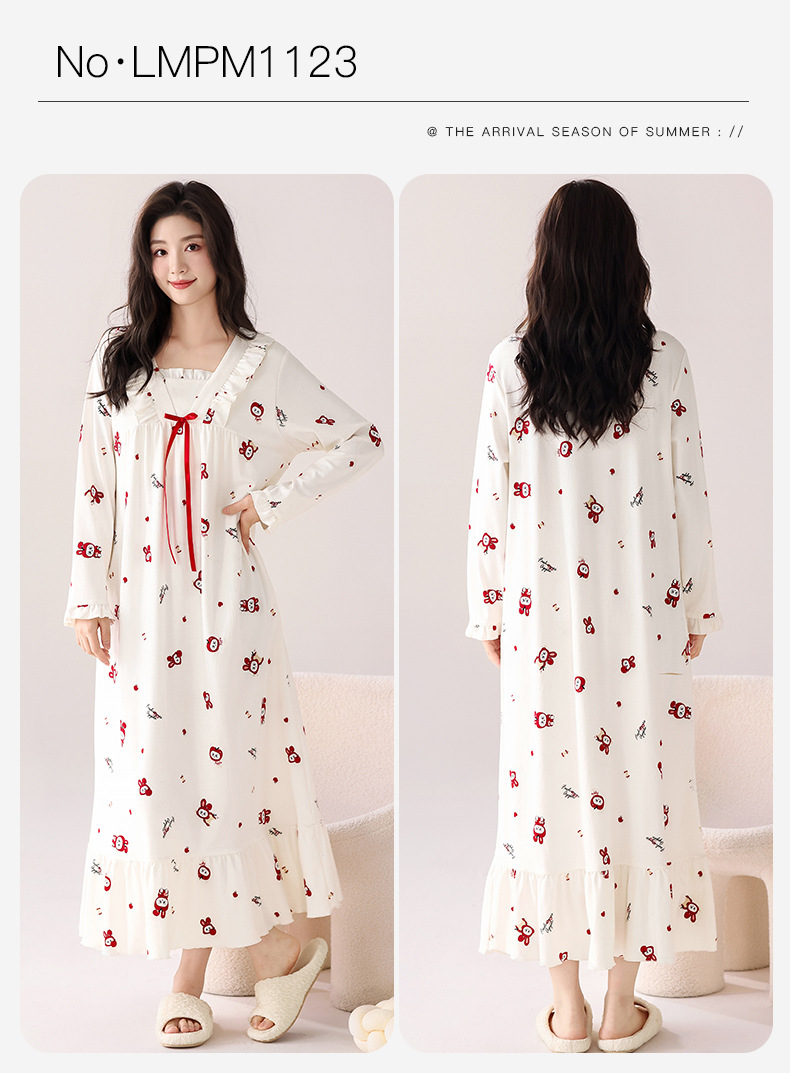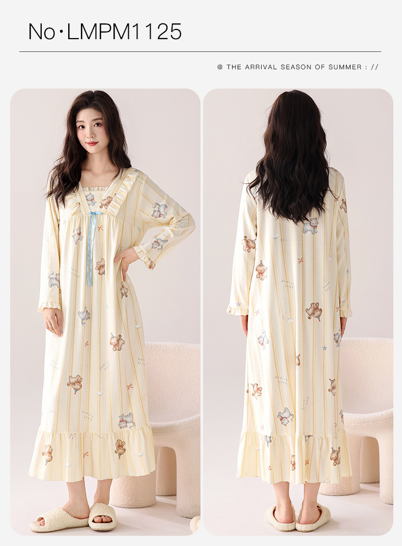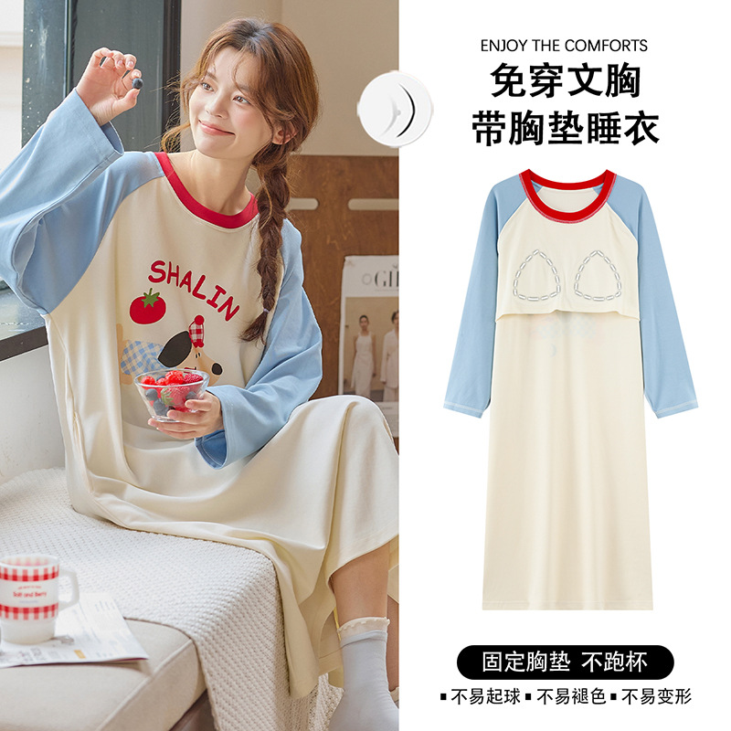 带胸垫纯棉睡裙女新款春秋长袖长裙柔软卡通透气家居服睡衣可外穿