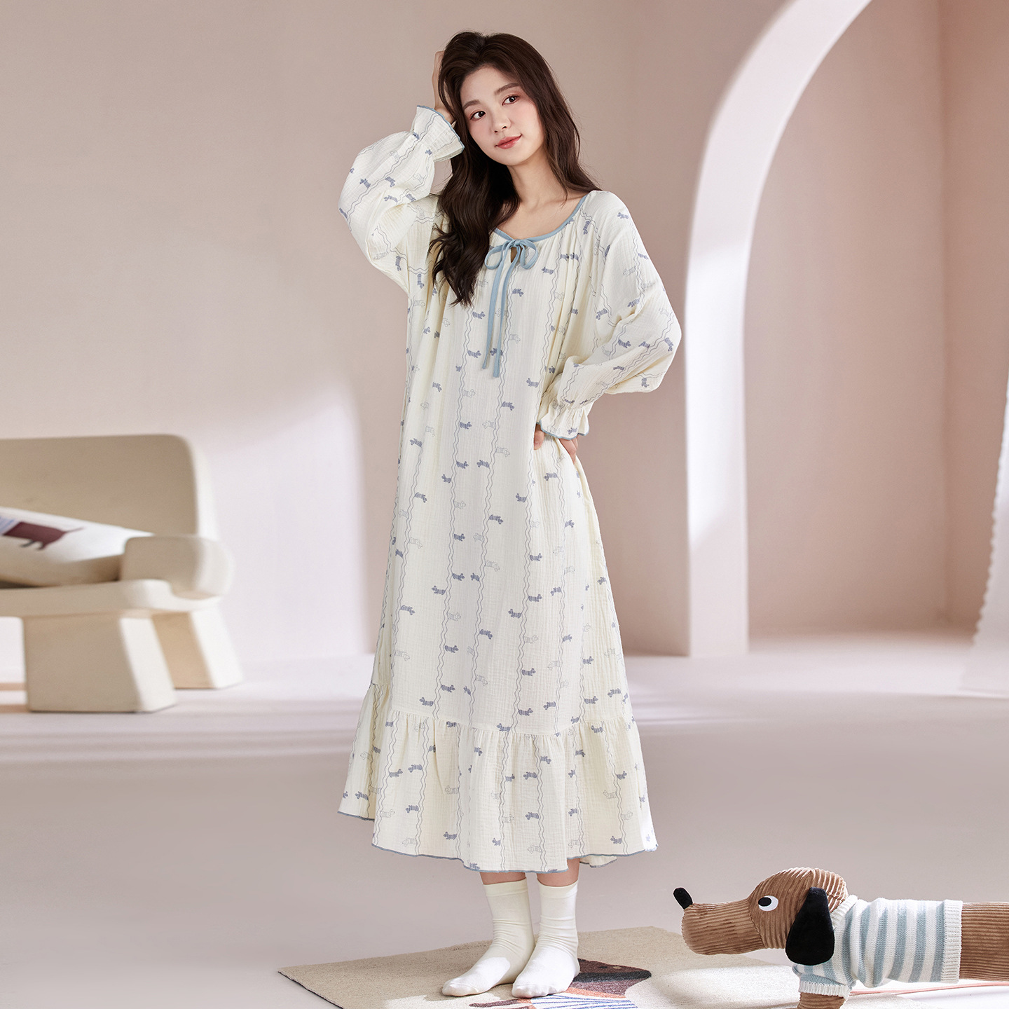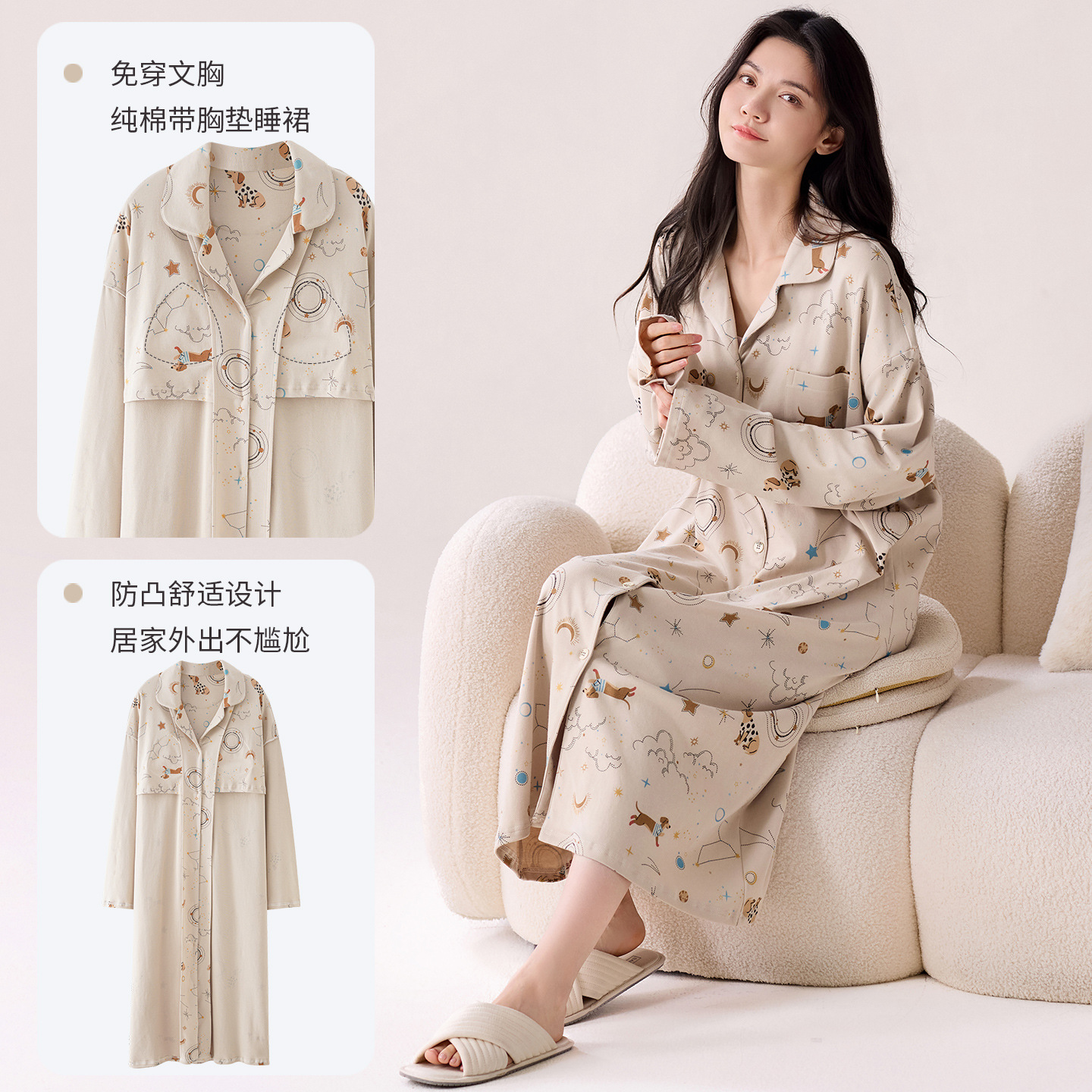 带胸垫睡裙女春秋100%纯棉舒适长袖宽松中长裙翻领可爱狗狗家居服
