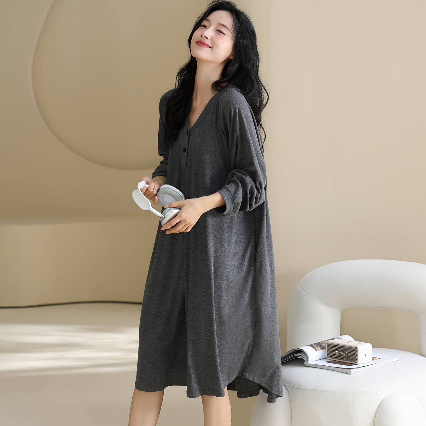 莫代尔睡裙女彩棉螺纹V领套头长袖连衣裙宽松舒适春秋纯色家居服