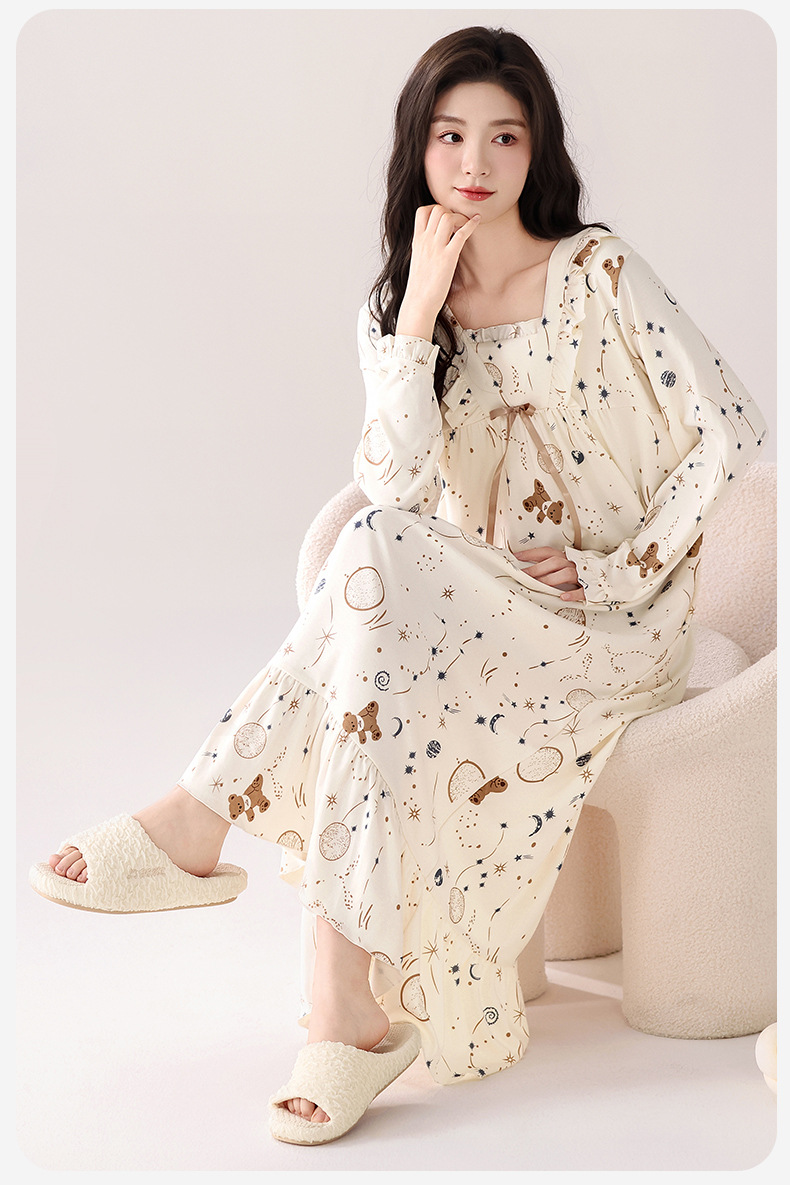 带胸垫长袖95棉拉架爽棉卡通少女睡裙女韩版甜美睡衣连衣裙可外穿