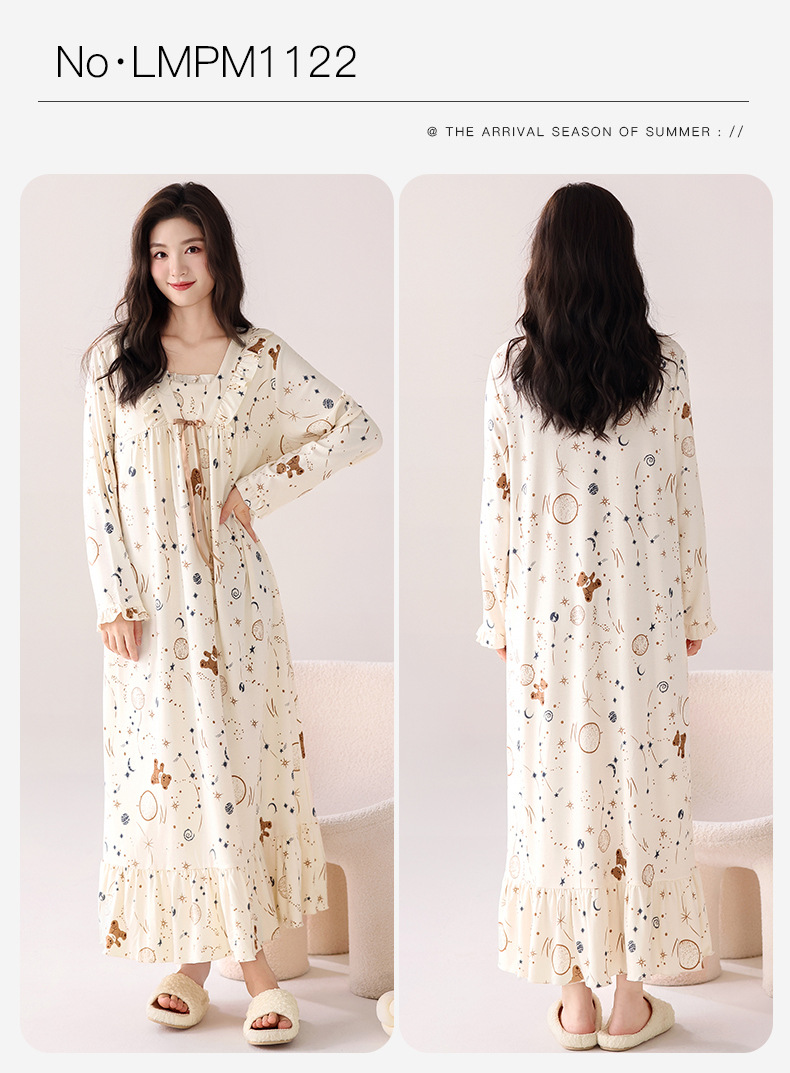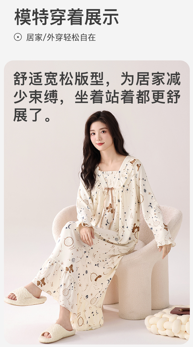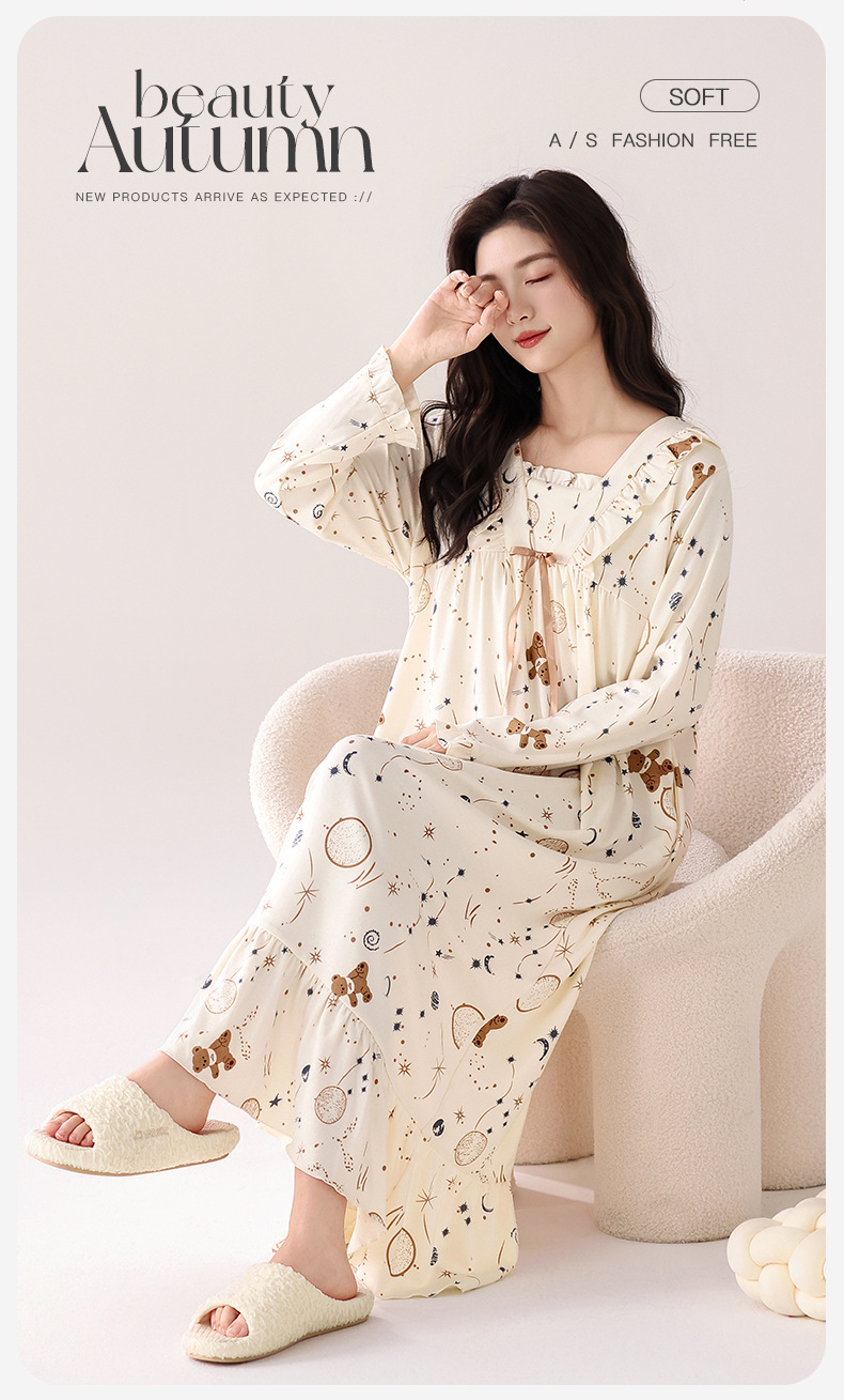 秋季新品彩棉螺纹睡裙女圆领长袖长款柔软莫代尔连衣裙纯色家居服