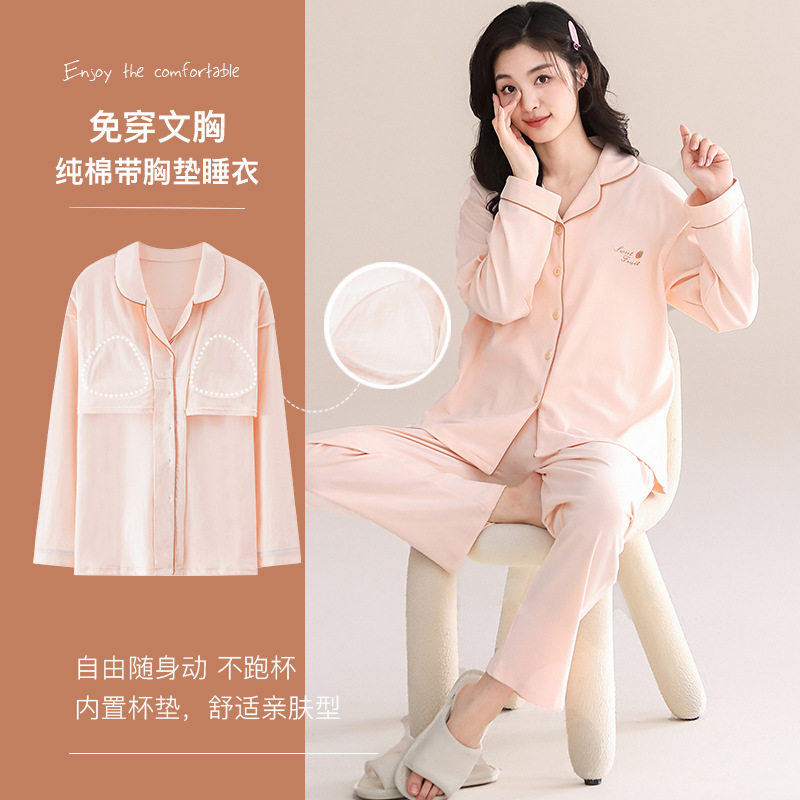 ファッション綿パジャマ女性2024秋の新しい胸パッド付き女性長袖ゆるいカーディガン家庭服2点セット