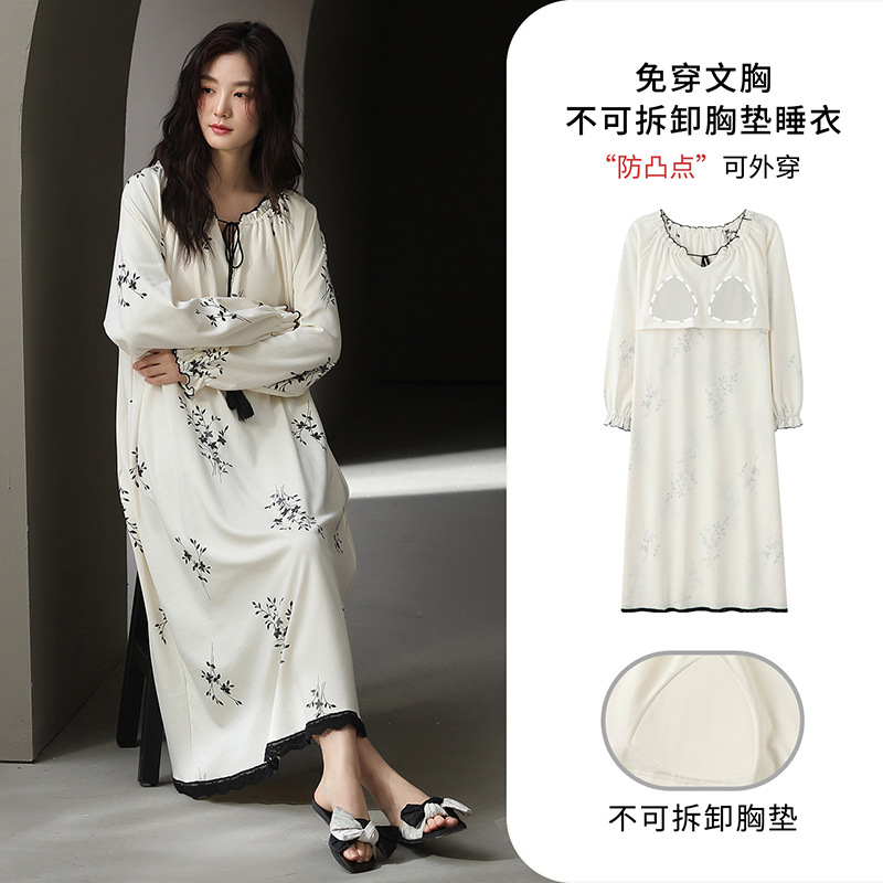 100纯棉睡裙女士秋季中长款2025新款甜美印花带胸垫春秋款家居服