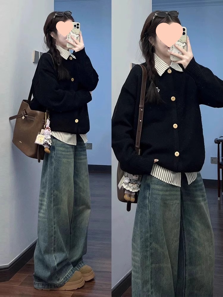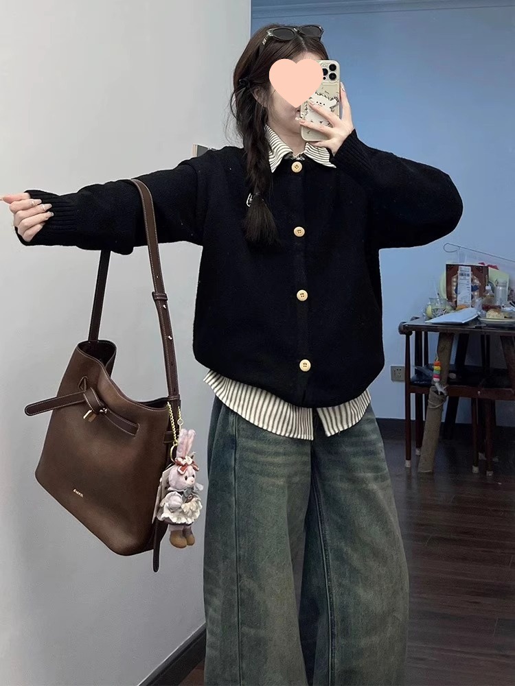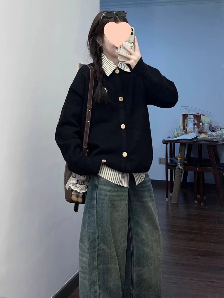 韩系黑色圆领学院风针织开衫女秋冬季新款慵懒宽松加厚外穿上衣潮