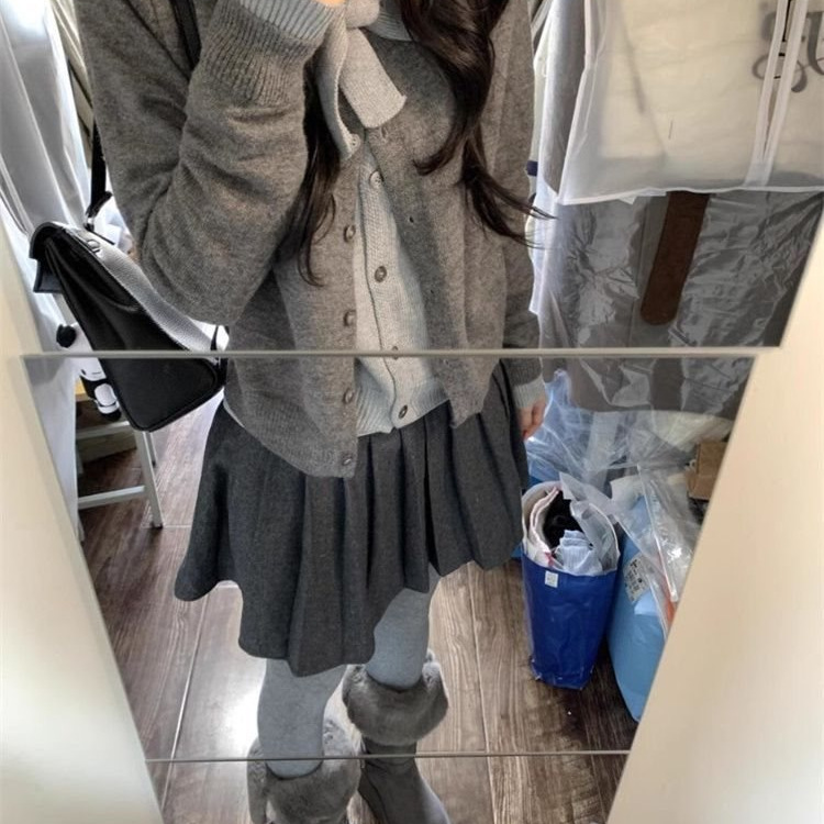 miu系穿搭假两件蝴蝶结学生格雷灰色针织开衫女春季短款毛衣外套