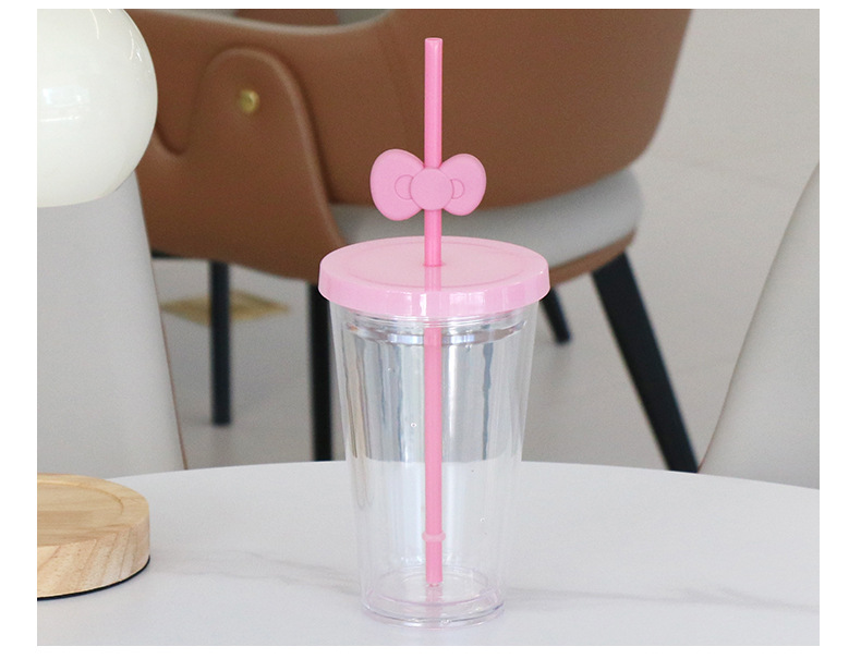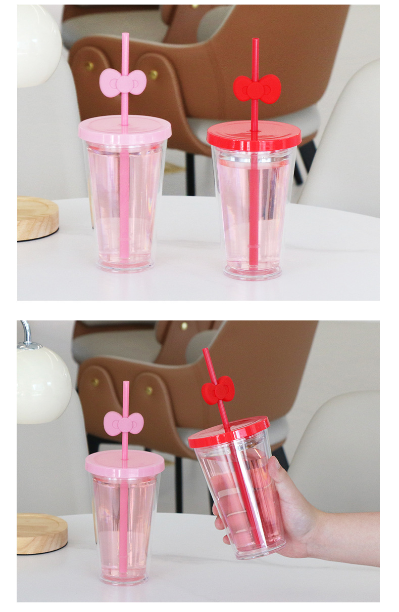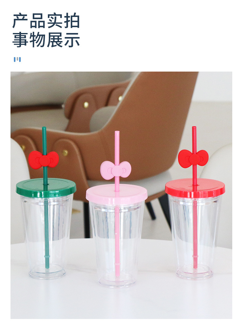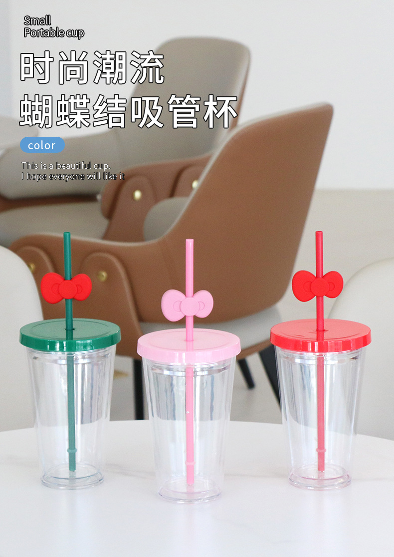 跨境亚马逊双层塑料咖啡杯大容量男女蝴蝶结吸管杯直饮杯厂家批发