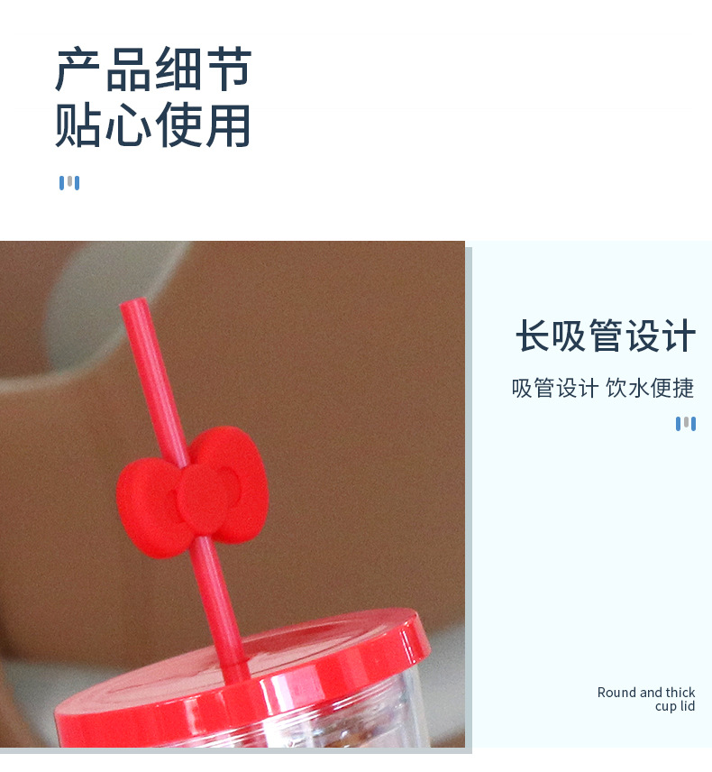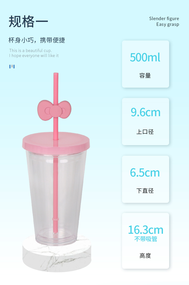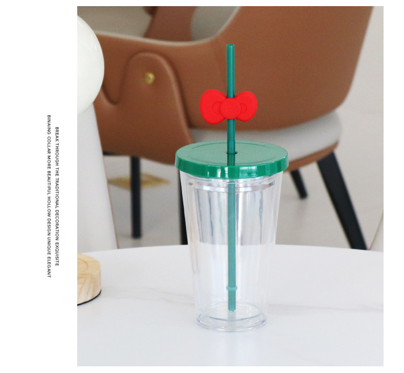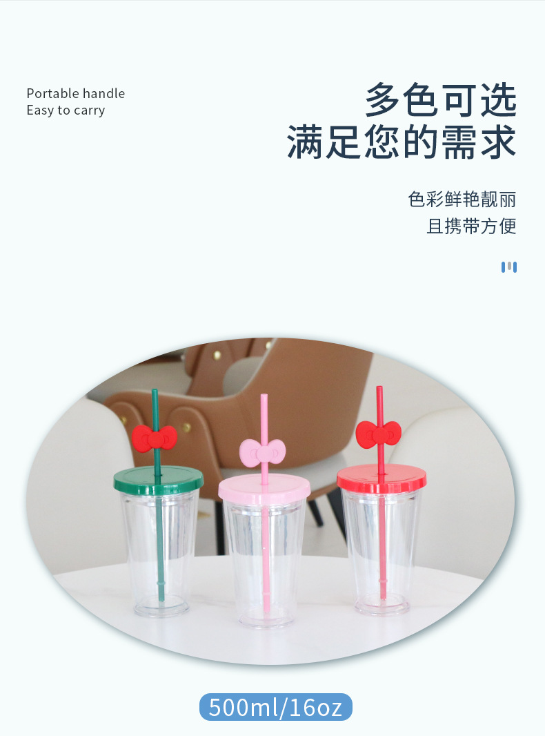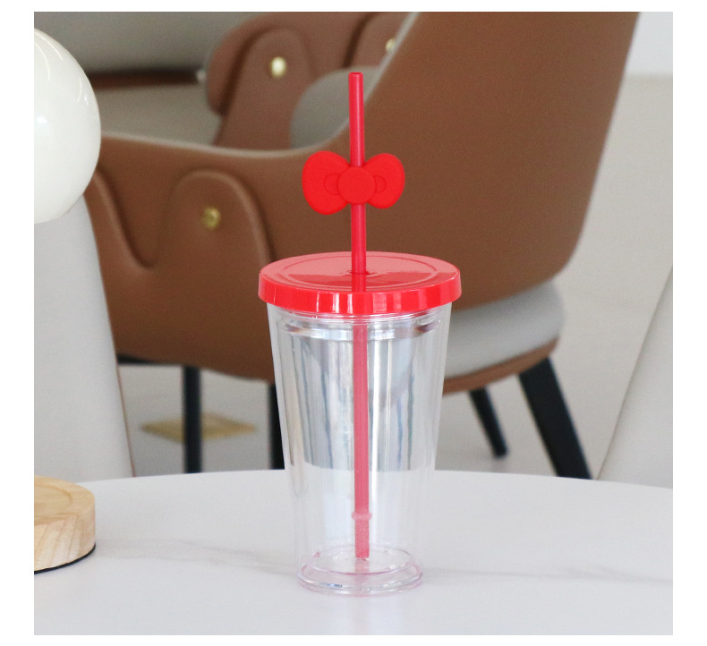 跨境亚马逊双层塑料咖啡杯大容量男女蝴蝶结吸管杯直饮杯厂家批发