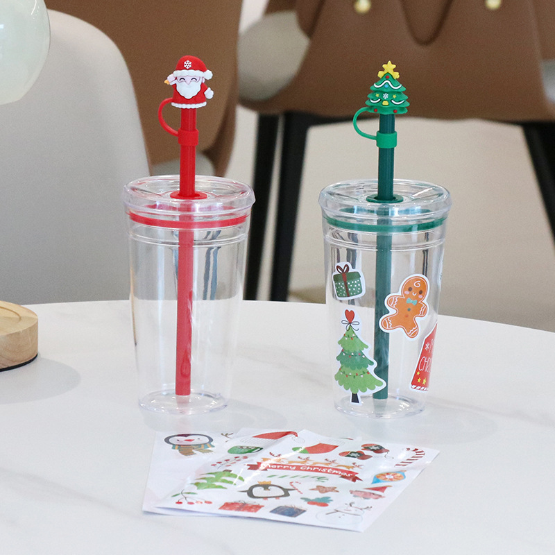 外贸新款卡通饮水杯圣诞节日氛围吸管杯PS透明果汁茶饮随手杯批发