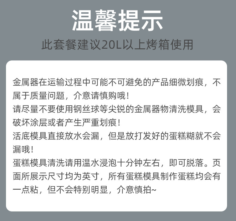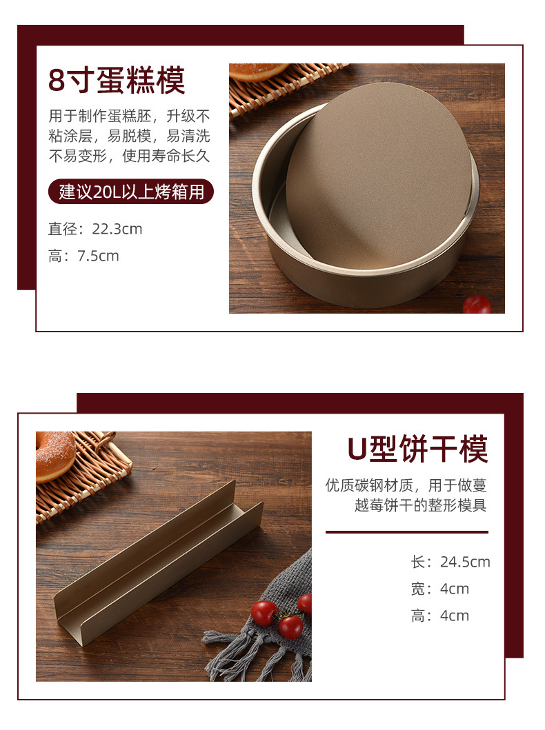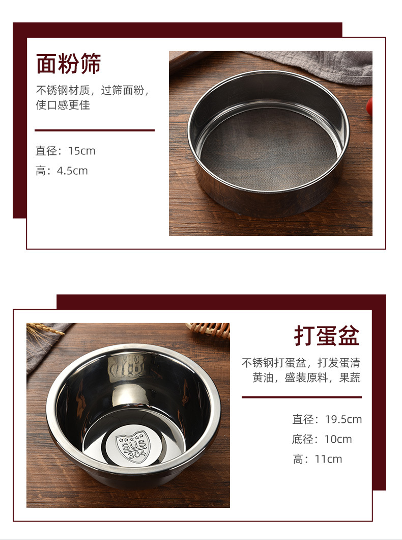 规格 8寸蛋糕模具+6连模具+8寸披萨盘+10寸吐司盒.,8寸蛋糕模具+6连模具+8寸披萨盘+10寸吐司盒+15cm面粉筛.,8寸蛋糕模具+6连模具+8寸披萨盘+10寸吐司盒+打蛋盆.,8寸蛋糕模具+6连模具+8寸披萨盘+10寸吐司盒+打蛋盆+面粉筛.,8寸蛋糕模具+6连模具+8寸披萨盘+10寸吐司盒+曲奇饼干模具.,烘焙模具六件套.,8寸蛋糕模具+6连模具+8寸披萨盘+10寸吐司盒+方形烤盘.,8寸蛋糕模具+6连模具+8寸披萨盘+10寸吐司盒+方形烤盘+面粉筛1,烘焙模具七件套2
