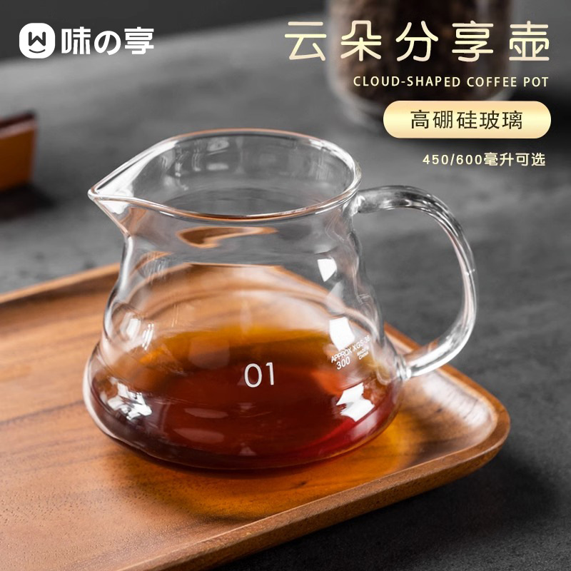 手淹れコーヒーポット、クラウドポット、シェアリングポット、目盛り付き厚手耐熱ガラス、フェアフィルターカップ、水出しアメリカンケトル