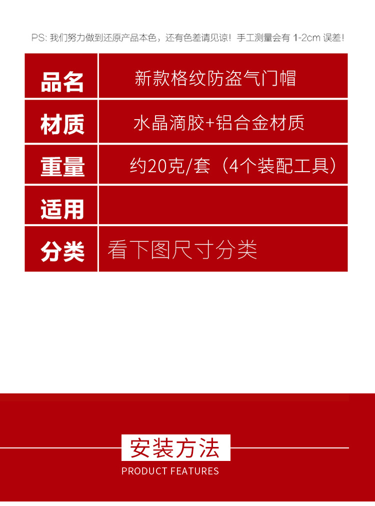 规格 银色半六角普通款(5个装),银色半六角防盗款(5个装配工具,银色高档半菱格普通款(4个装),银色高档菱格防盗款4个装配工具,黑色高档菱格普通款(4个装),黑色高档菱格防盗款4个装配工具,宝马 新款银色【4个装】,宝马 新款黑色【4个装】,宝马 新款红色【4个装】,适用于其它车型请联系客服备注
