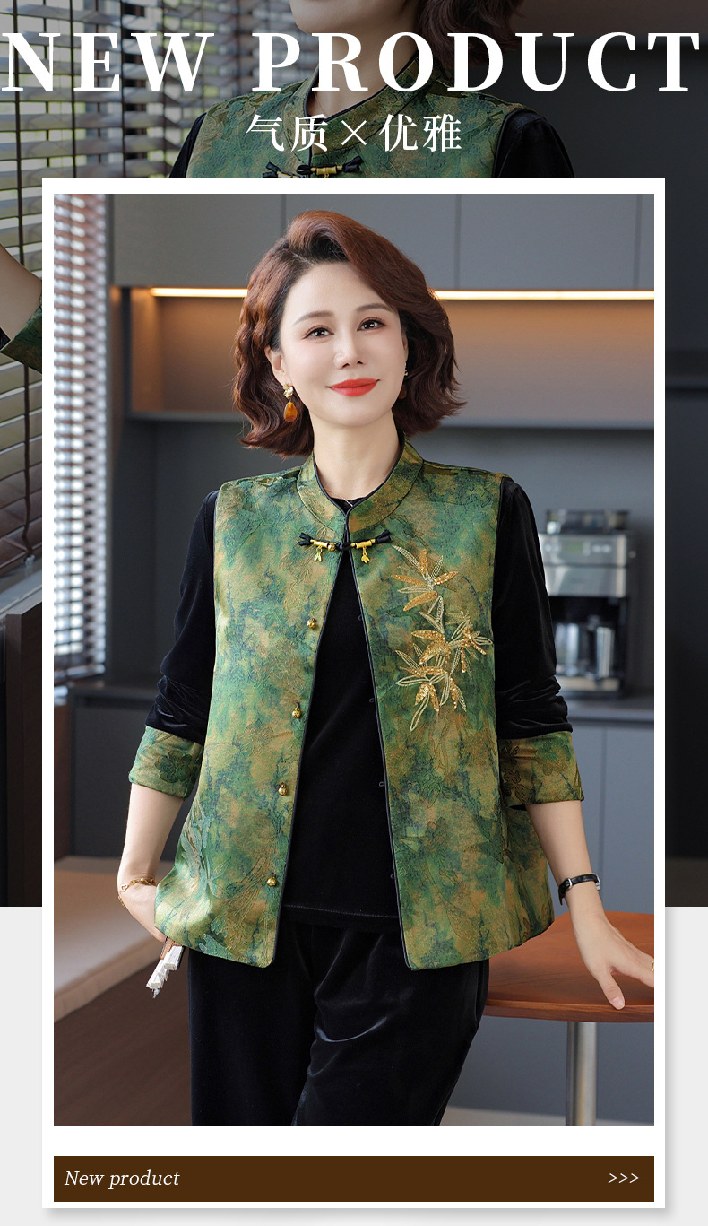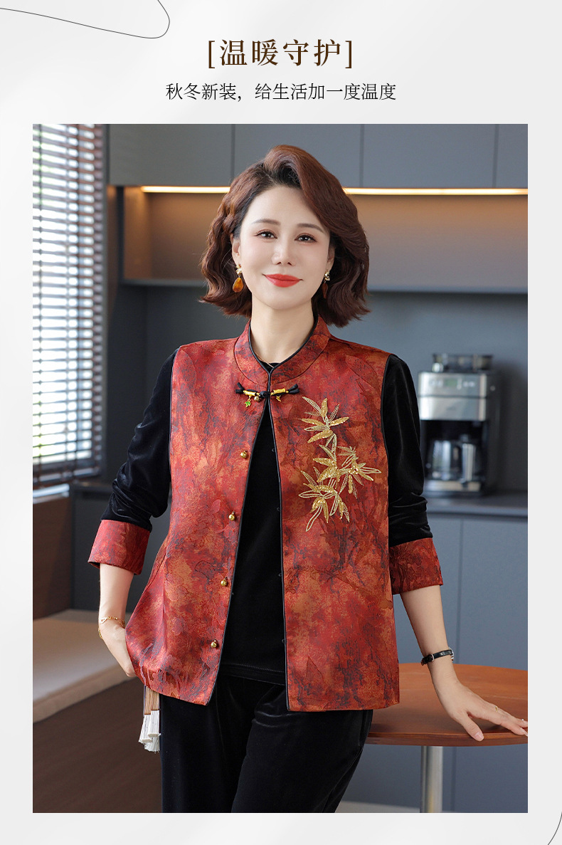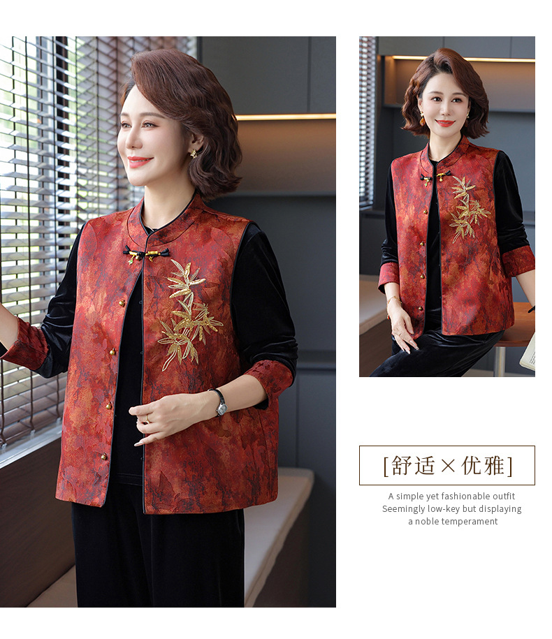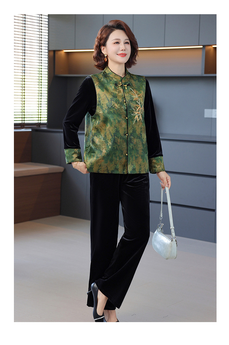 新中式妈妈秋装金丝绒套装2025新款中老年女春秋中国风马甲三件套