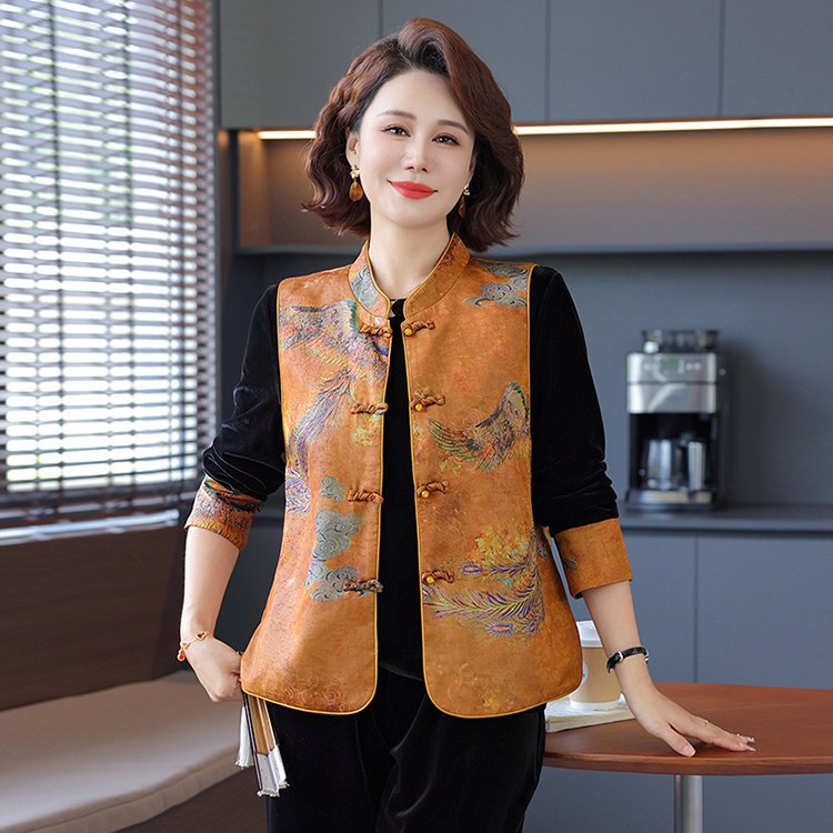 妈妈秋装新中式套装阔太太国风马甲上衣中老年女装气质丝绒三件套