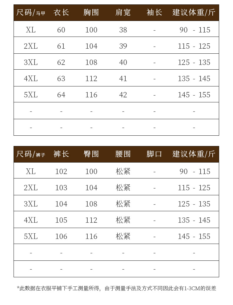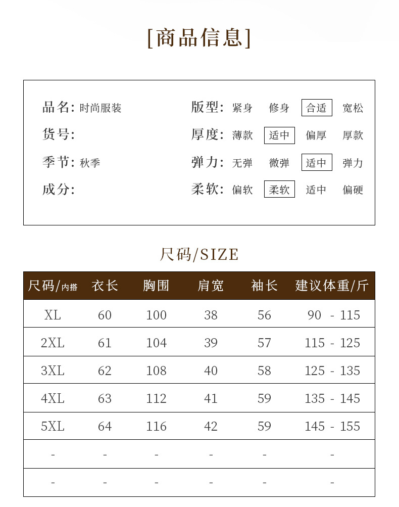 尺码 XL(建议90-115斤),2XL(建议115-125斤),3XL(建议125-135斤,4XL(建议135-145斤),5XL(建议145-155斤)