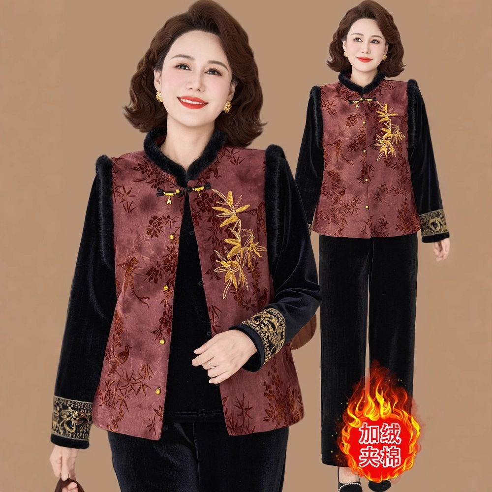 新中式妈妈秋冬加绒套装大码中老年女冬国风夹棉马甲三件套