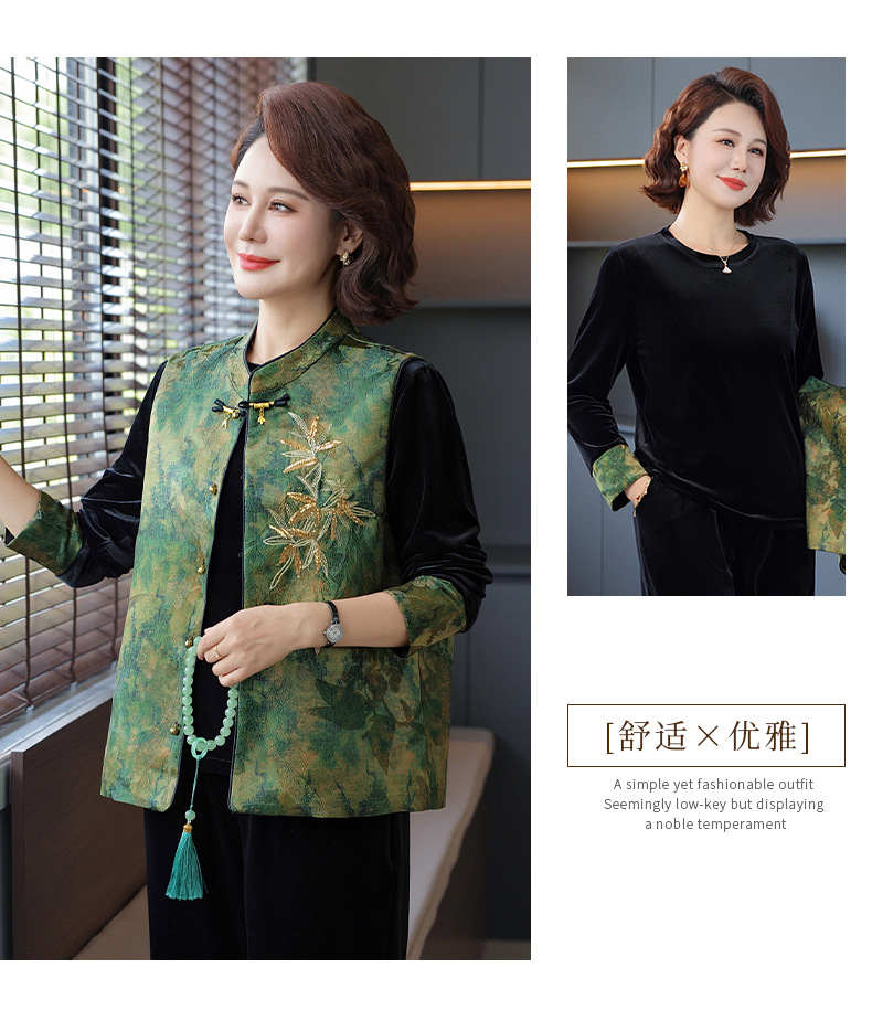 中年妈妈秋装金丝绒套装洋气三件套中老年女新中式马甲春秋上衣服