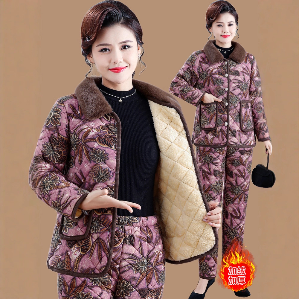 妈妈冬装加绒加厚棉衣棉裤套装中老年女装秋冬洋气保暖棉服两件套