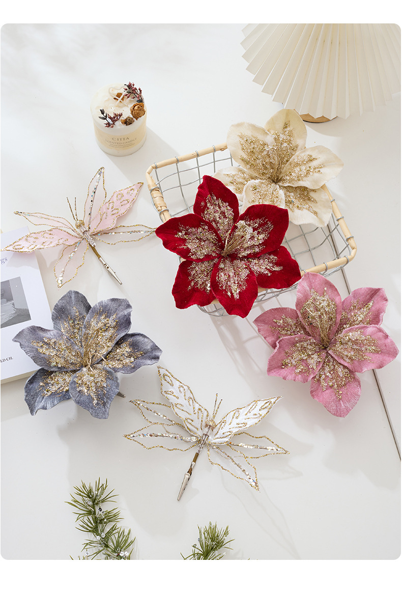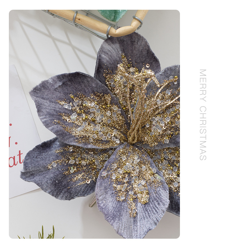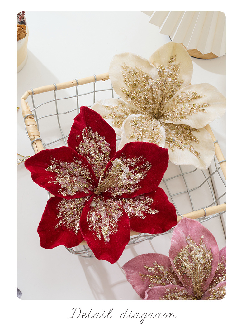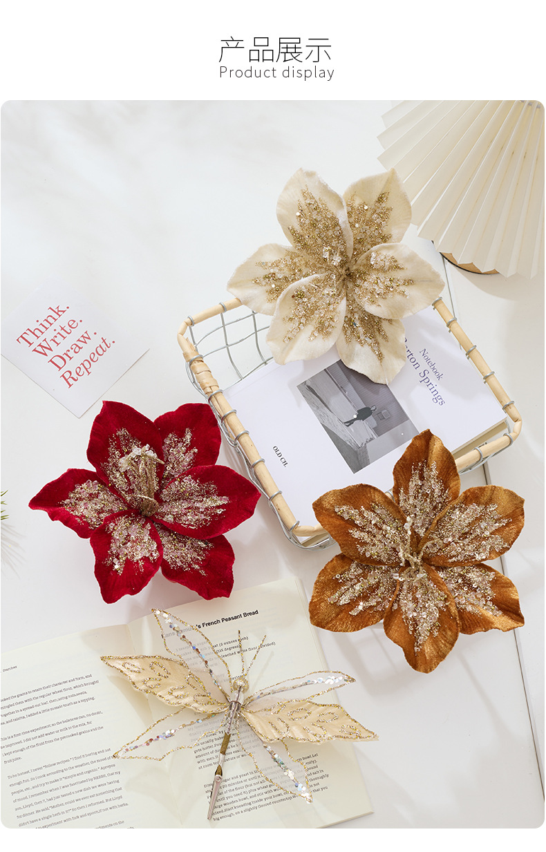 亚马逊跨境圣诞花装饰品金色红色亮片闪粉仿真圣诞花圣诞树配饰