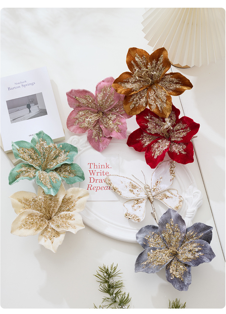 跨境金粉布艺圣诞花多款式圣诞花配件装饰品圣诞树装饰仿真花挂件