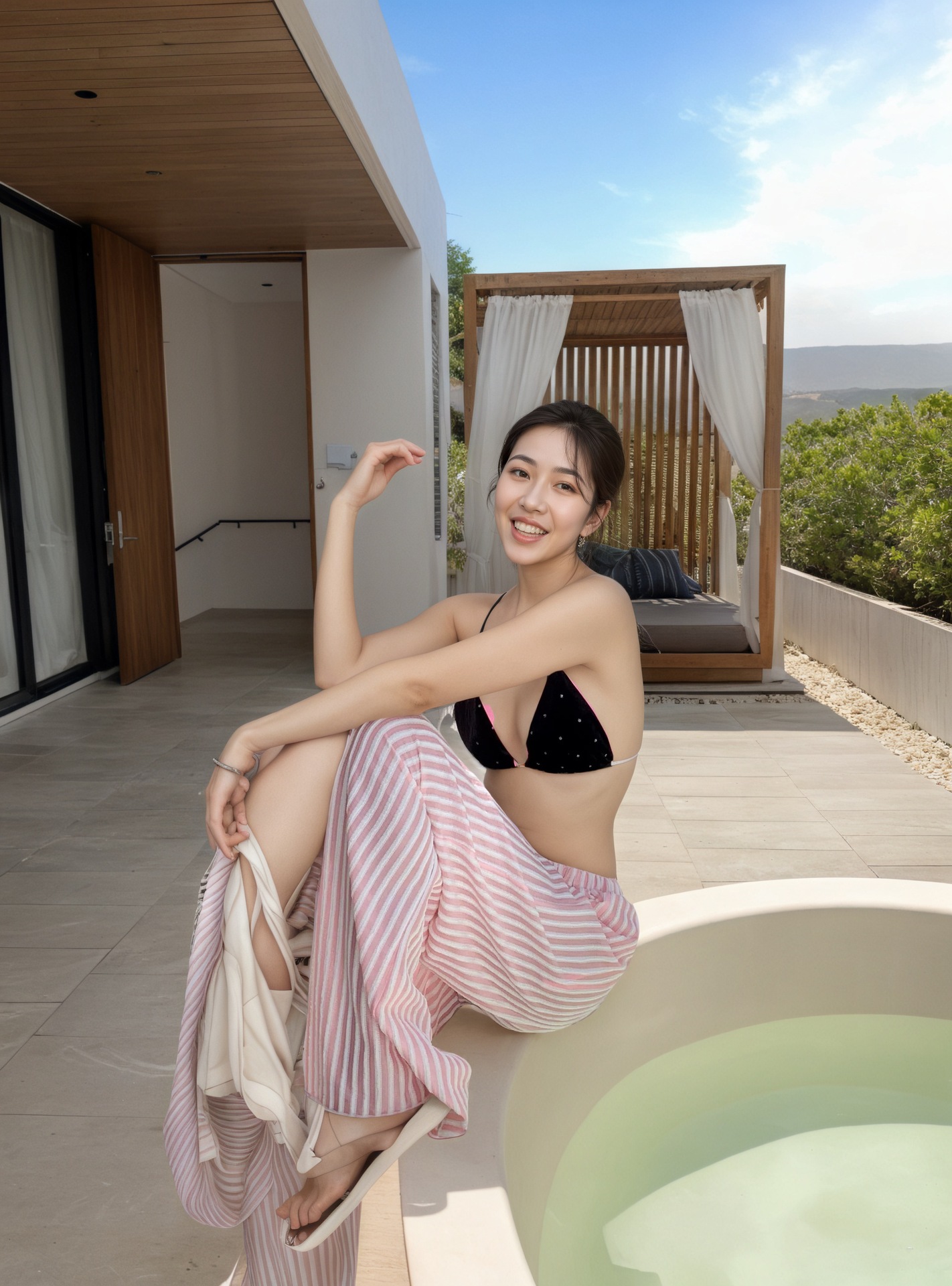 ビーチリゾート温泉ピンクのピンクのビキニの水着の女性のスチールが集まっています。