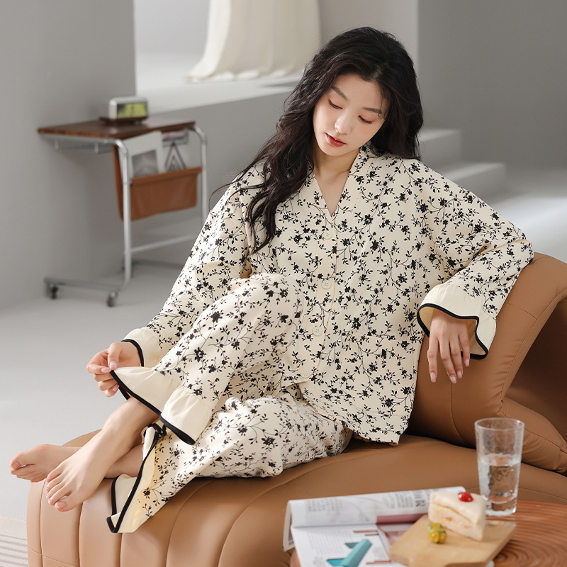 A类抗菌 95棉爽棉睡衣女长袖长裤高档开衫翻领家居服两件套装外穿