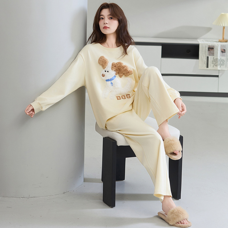带胸垫100%纯棉长袖长裤睡衣女韩版宽松新款女士高档全棉家居服冬