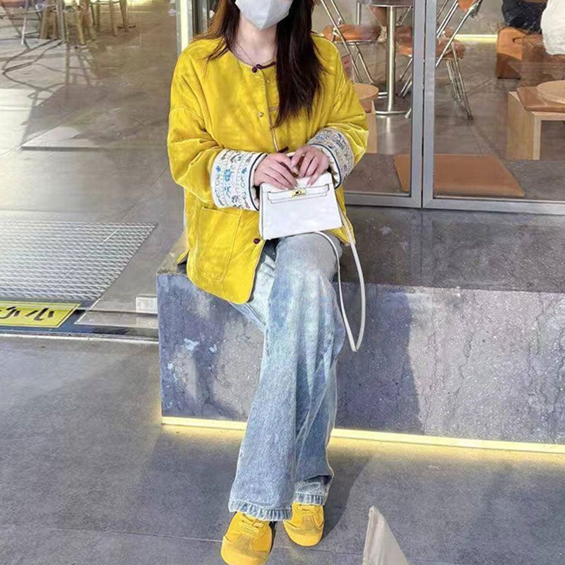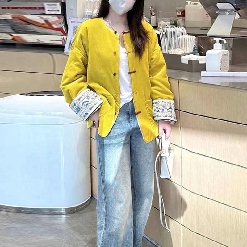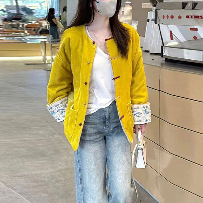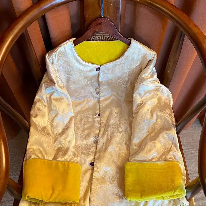 新中式国风盘扣加棉冬装黄色丝绒外套女高端真si年轻唐装夹棉服袄