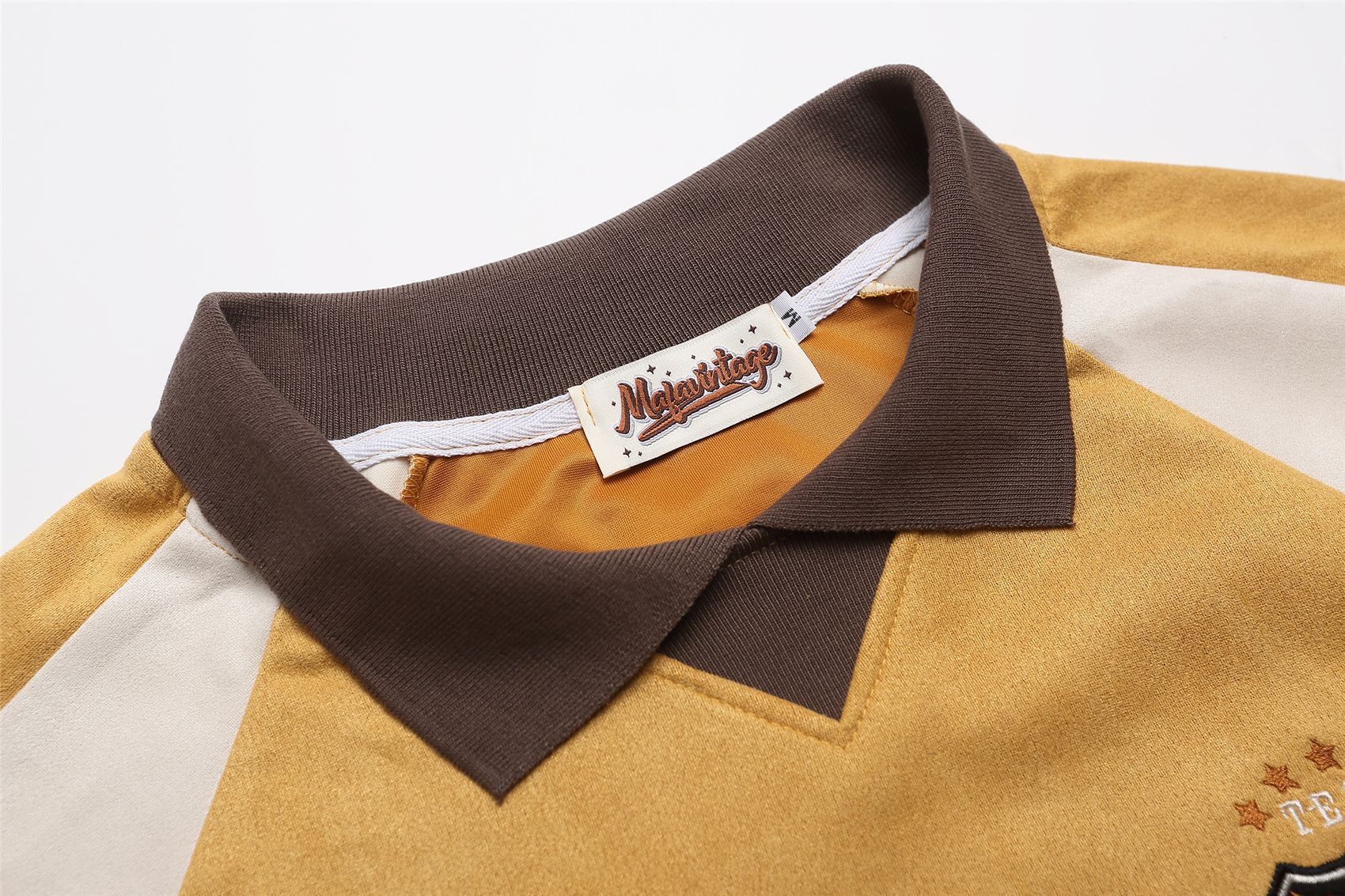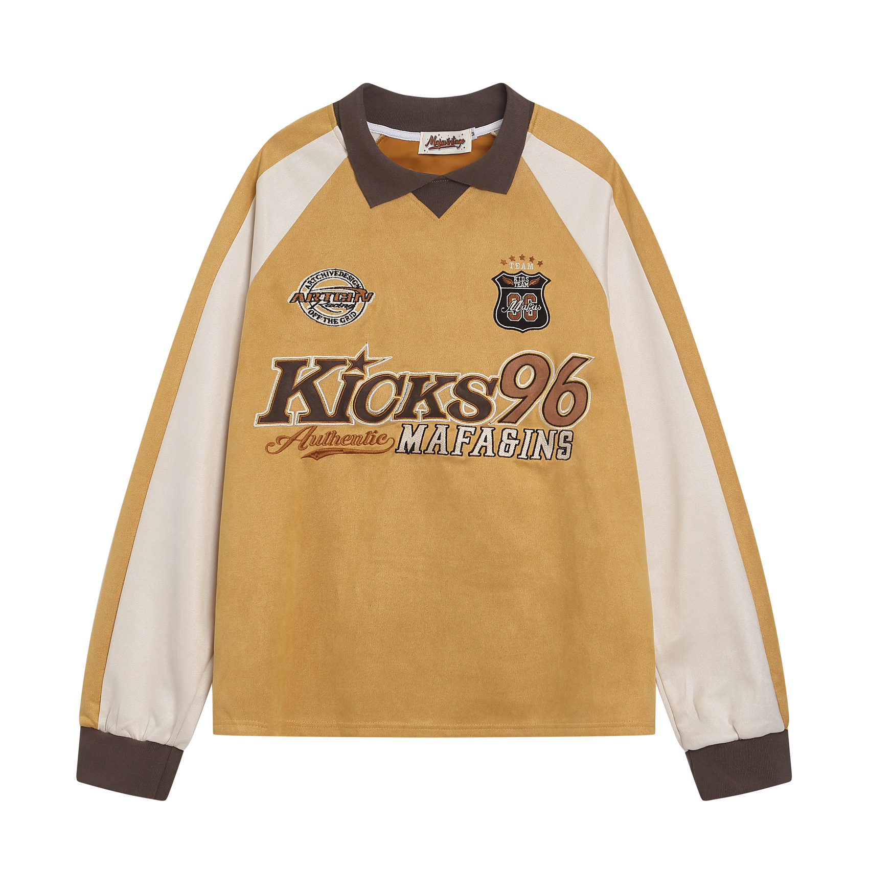 美式复古撞色字母刺绣小翻领长袖T恤男女秋季宽松休闲情侣上衣