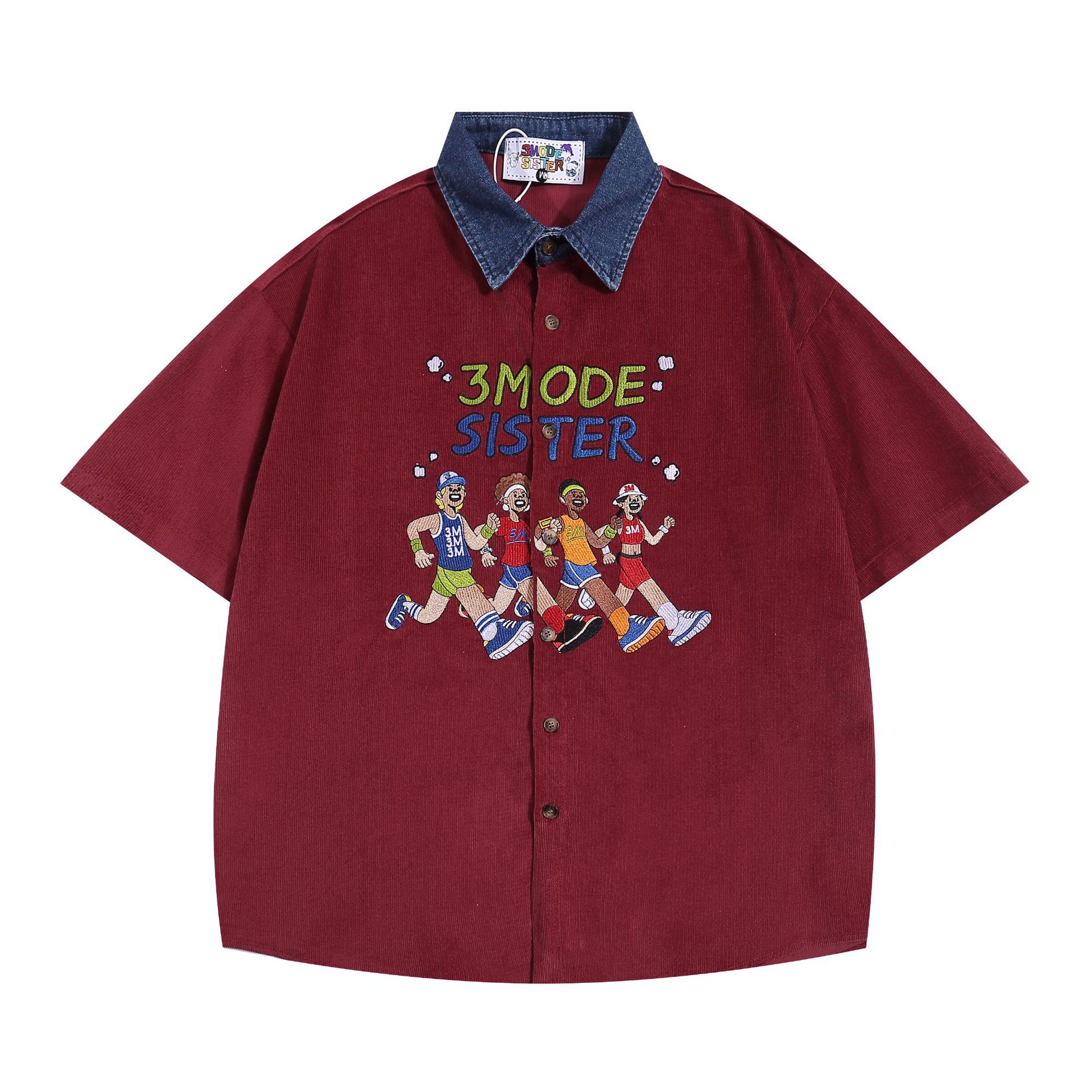 楽しい漫画の文字刺繍コーデュロイ半袖シャツメンズアメリカンレトロルーズカップルカジュアル多用途シャツ
